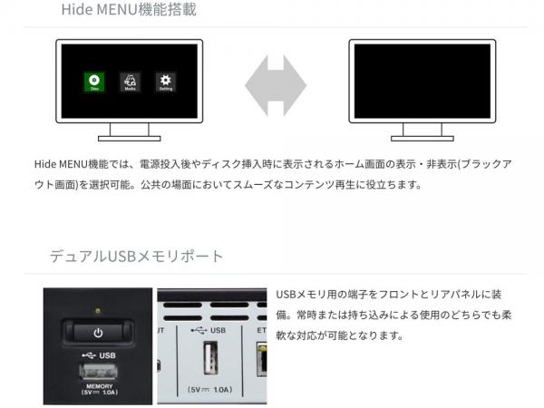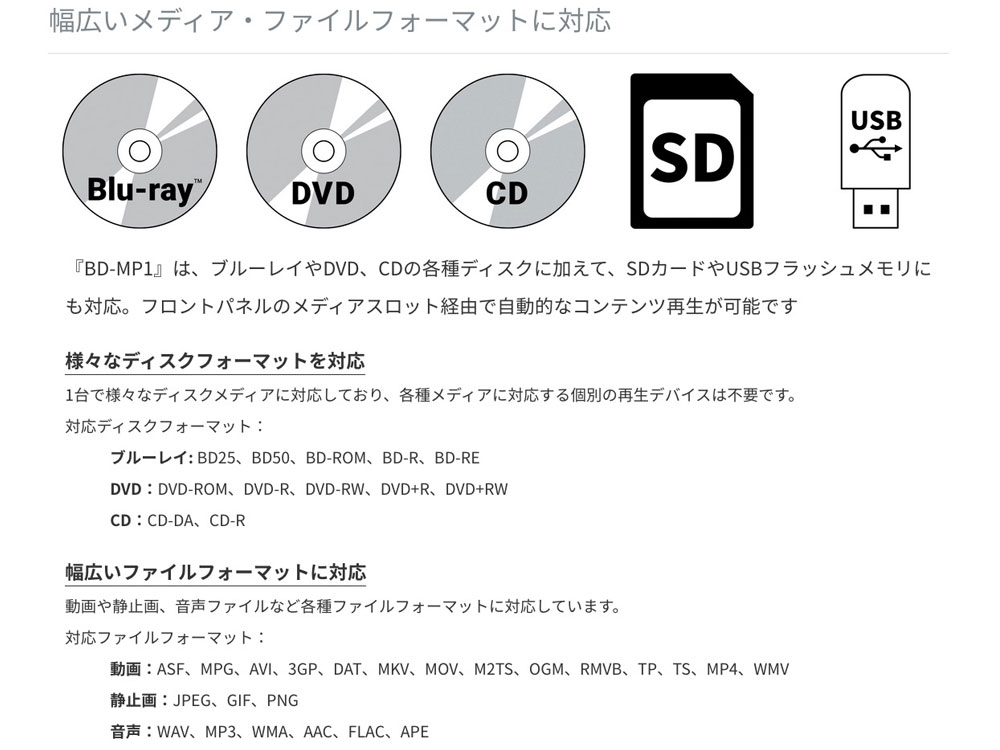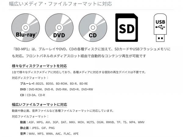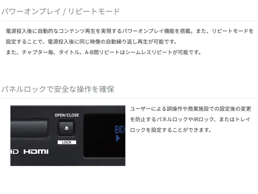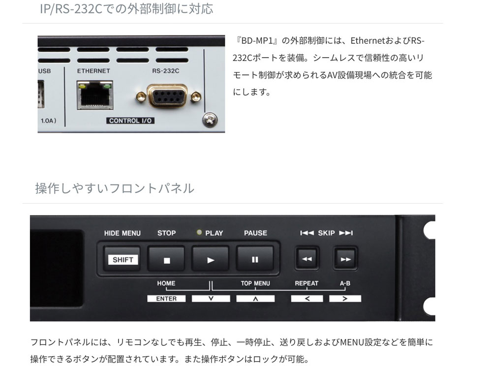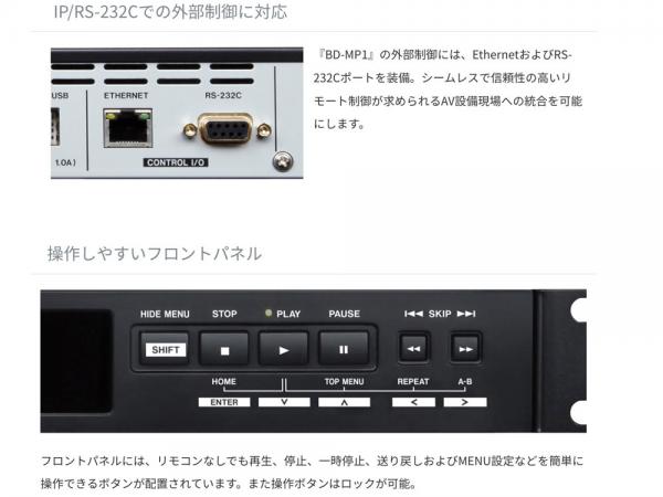 『BD-MP1』は、ブルーレイや DVD、CD、SD カード、USB メモリの再生が可能なブルーレイ/マルチメディアプレーヤー です。電源投入後に自動再生するパワーオンプレイ機能や、繰り返し再生のリピート機能、誤操作を防止するボタン やリモコンのロック機能を装備するほか、イーサネットや RS-232C によるリモートコントロールが可能。商業施設や文 教施設、美術館、博物館、バンケットルーム、劇場など様々な場所でのコンテンツ再生に対応します。