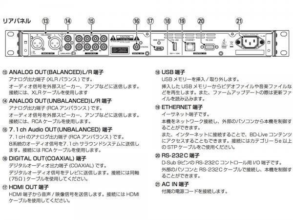 | ◆付属品 | ・リモコン(RC-BDMP1)、電源コード、3P-2P変換アダプター、ラックマウントビスキット、 取扱説明書(保証書付き) |