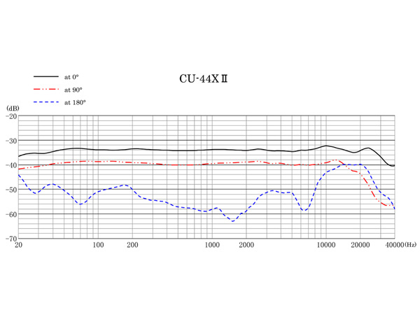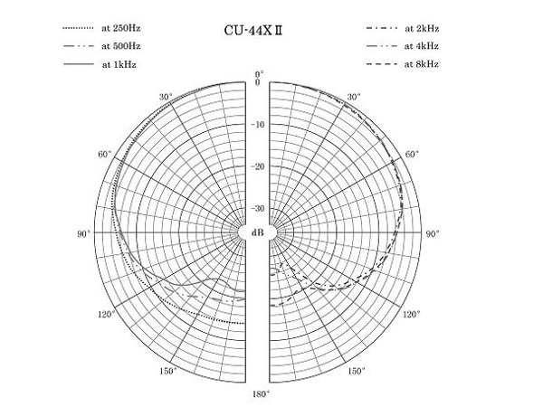 ◆ 理想的な単一指向性のポーラパターンを広い周波数帯域で実現。マイク正面に対し、0度、60度、90度、130度での周波数特性は全帯域にわたってフラットで、感度だけが単一指向性特性に沿って滑らかに減衰していきます。このため直接音はもとより、反射音までが忠実に収音できます。