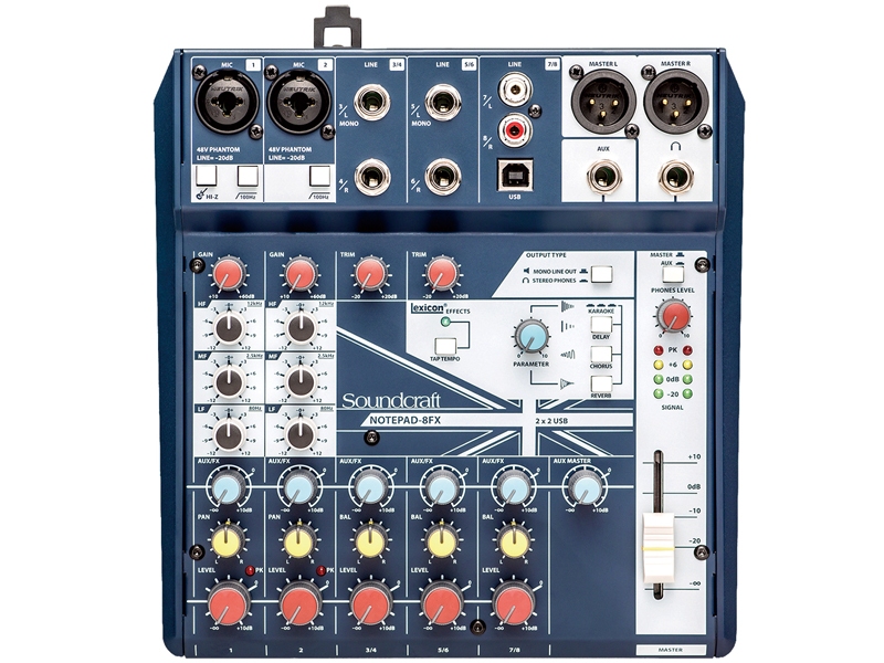 ・Notepad-8/12FXにはスタジオ品質のLexicon PRO製エフェクト・プロセッサーを搭載しています。世界的に評価の高いリバーブのほか、ディレイやコーラスも利用でき、一台で積極的な音作りが可能です。ボーカルの表現力を高めるカラオケモードも用意しました。