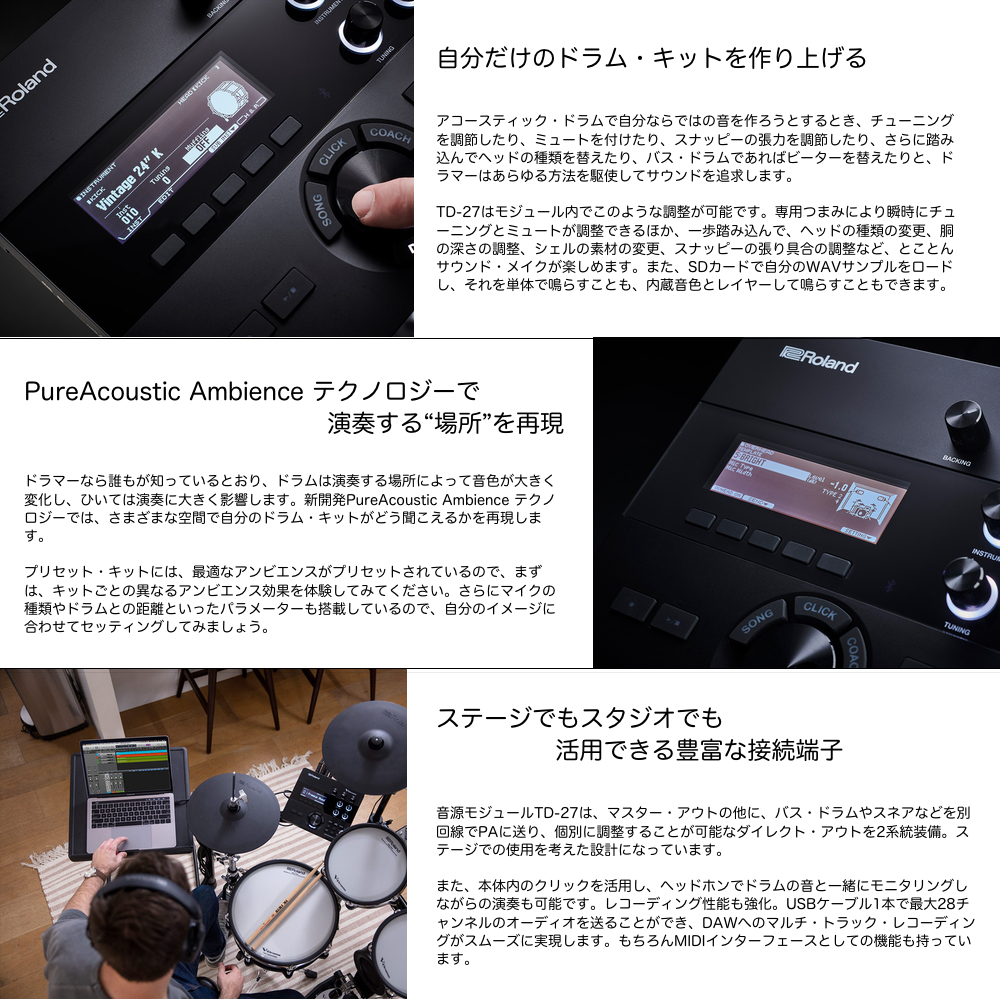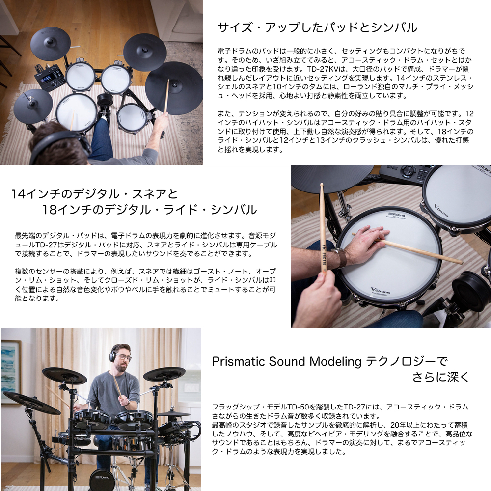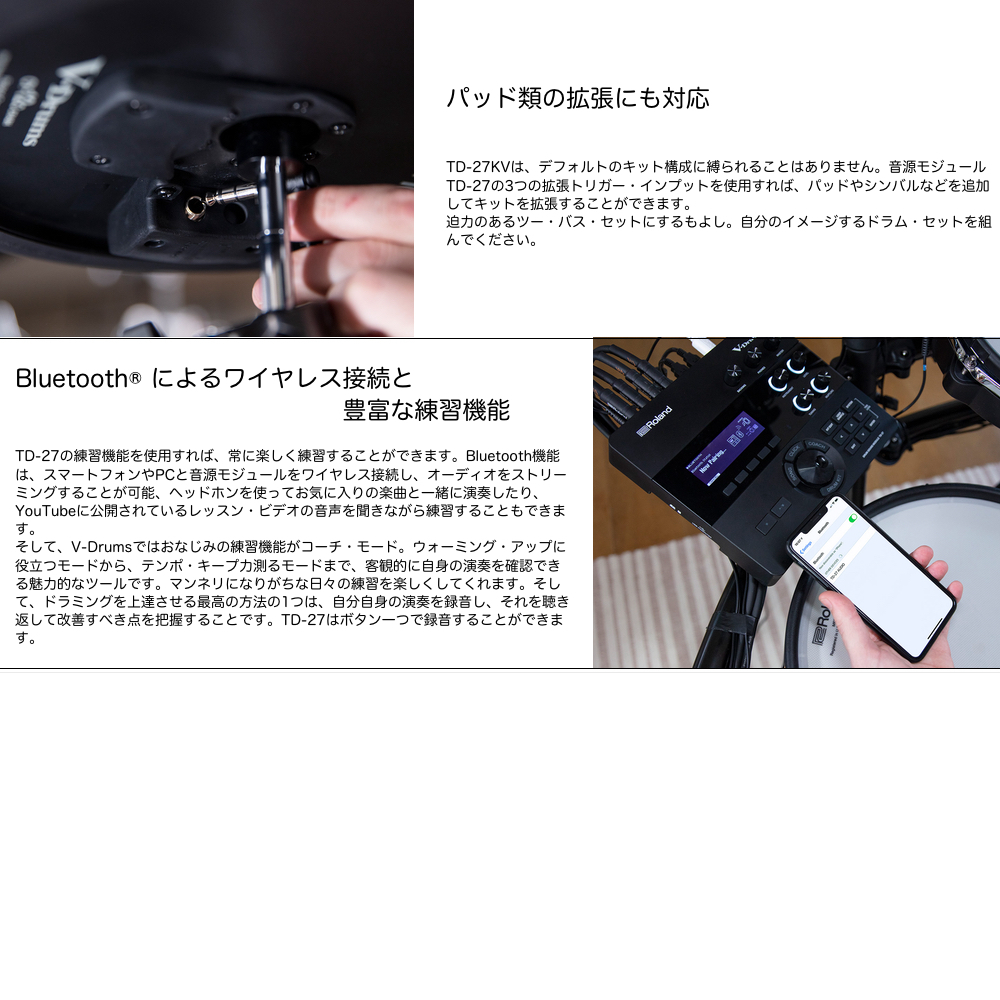 TD-27KV は、フラッグシップ・モデルTD-50 譲りの高い表現力を備えた音源TD-27 を中心に、