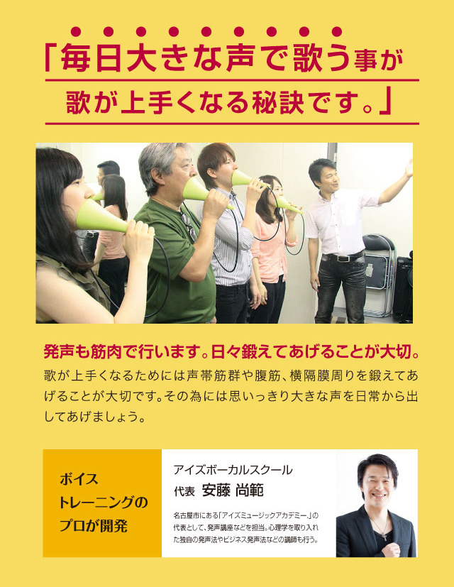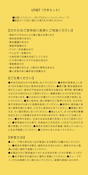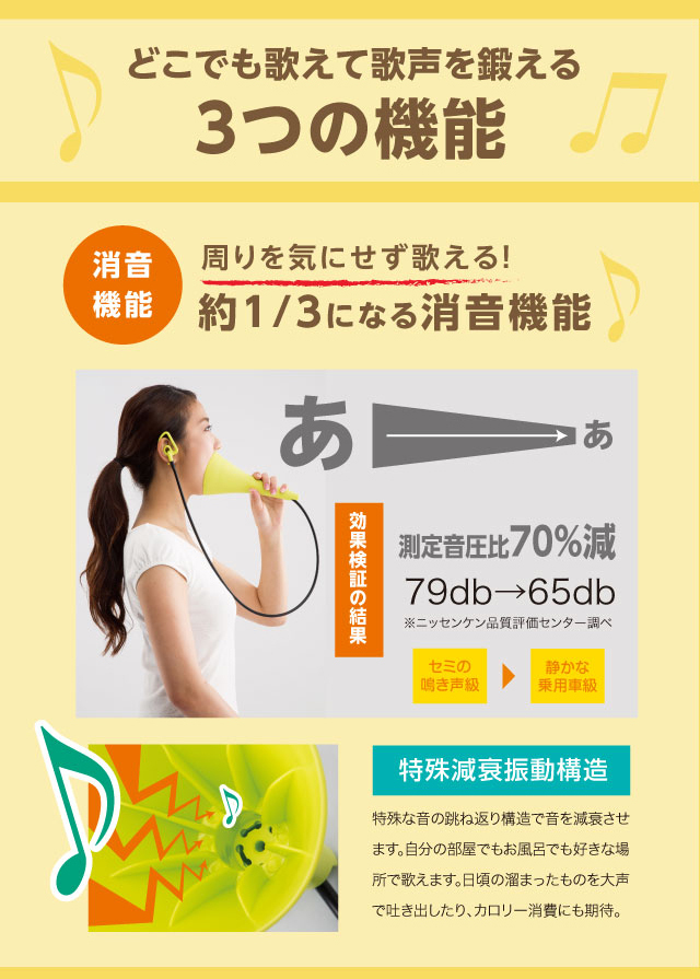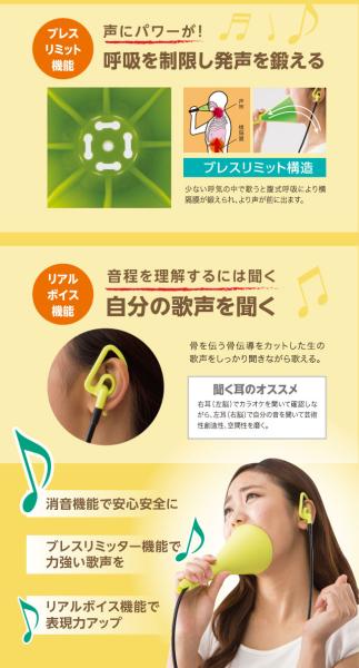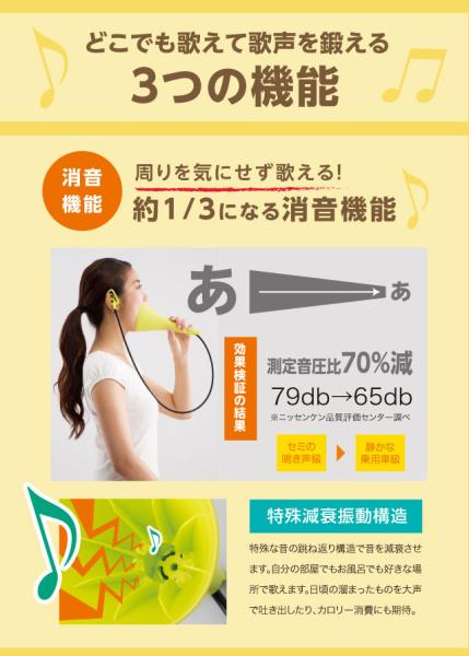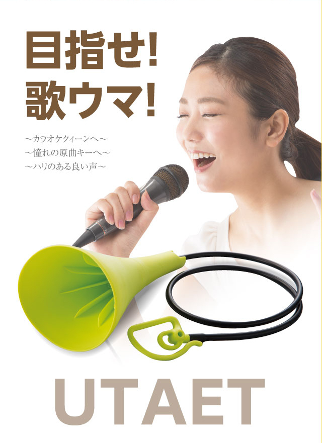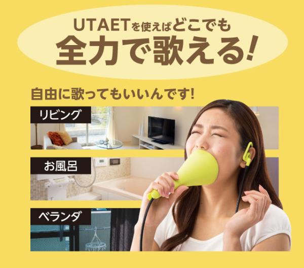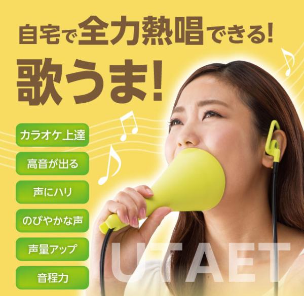 大きな声で歌えます UTAET ウタエット自宅で全力熱唱ができる!だから歌が上手くなる。ボイストレーニングの講師が開発。自宅で全力熱唱ができる!だから歌が上手くなる。ボイストレーニングの講師が開発。高い声を出したい!もっとハリのある歌声で歌いたいと思っている方!それなら毎日大きな声で歌った方が声帯が鍛えられます。とはいえ、普段の環境で全力で歌うのは周りが気になります。ウタエットは、消音機能を備えれており、自宅でも本気で歌えます。また、自分の声を聞きながら、より効果的なボイストレーニングできる構造になっています。好きな歌を全力で歌ってカラオケのスターになる!歌うことってダイエットにもいいですし!