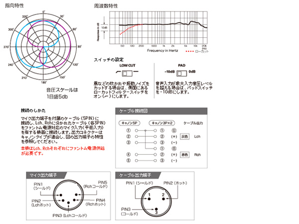 | ◆ ケーブル | マイク側(XLR-F5PIN)、出力側(XLR-M3PIN) |