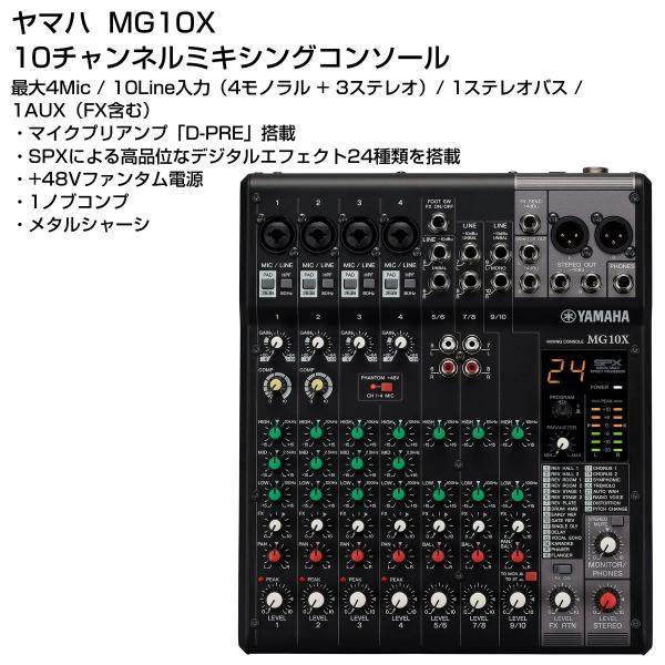 ミキサーは MG10X 、マイクの接続可能数は最大4本、エコーやリバーブなどのエフェクト機能を内蔵しているのでカラオケなどの歌唱にも対応できます。