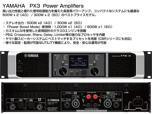パワーアンプは PX3。セットのスピーカーCBR12 4台を1台のパワーアンプで鳴らすことが可能です。8Ωスピーカーを2台ずつ合計4台を駆動する場合は4Ω駆動となり最大500W+500Wの出力となります。