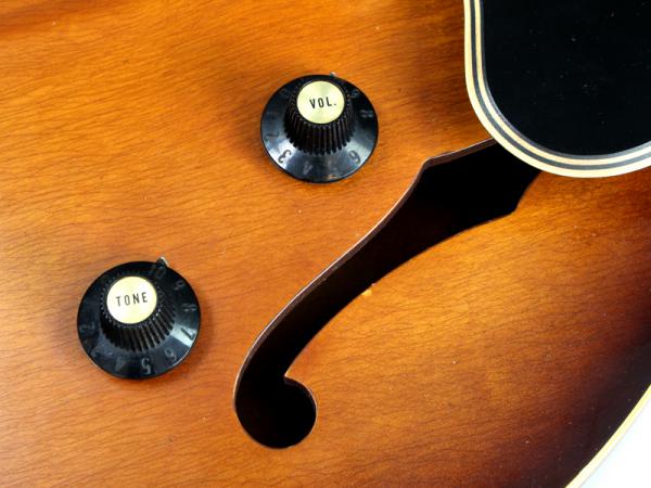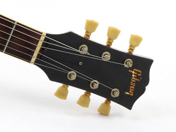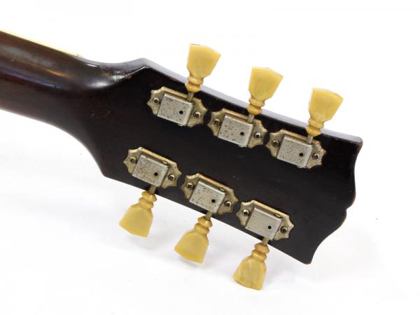 フレットはオリジナルのままが保たれているためやや低めとなっており、山自体は8部程残っていますが、高さは新品のフレットの6割ほどの残りです。ペグはオリジナルは1列刻印ホワイトボタンですが、当時のES-345等に取り付けられていた2列刻印2コブタイプのクルーソンスタイルに変更されています。また、トラスロッドカバーとノブも交換済みです。ピックアップ、ポット、コンデンサー配線などはオリジナルです。当時のチップボードケースが付属しておりますが、破損が見られますので実際の使用には不向きかと思います。15フレットのポジションマークが欠品していたので新しいものを打ちこんでいます。