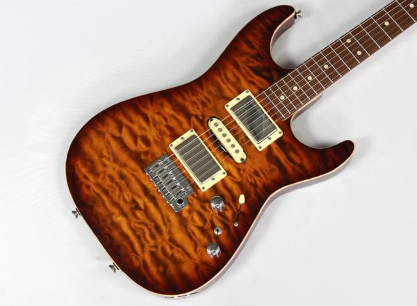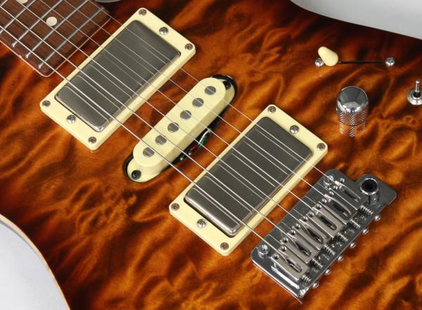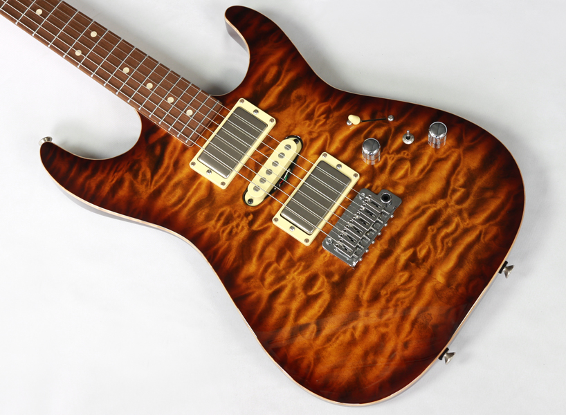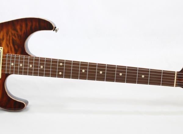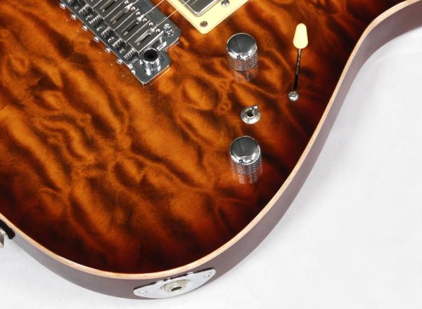 今回入荷したモデルは鮮やかなTiger eye Burstを採用し、目を奪われる程優美なブックマッチのフィギュアードメイプルを使用、トーンウッドであるバスウッドボディに絡むようになだらかな曲線にて張り付けられております。