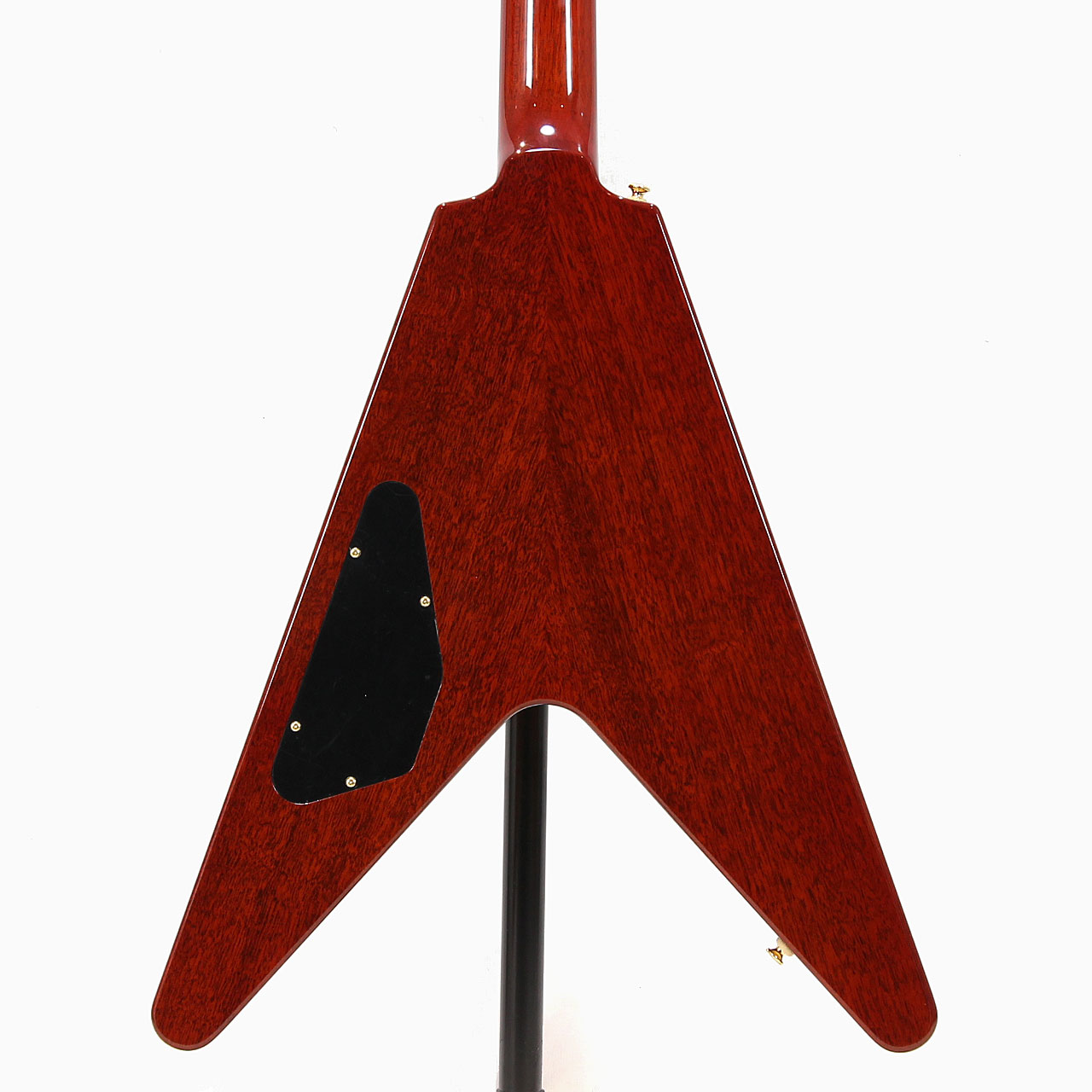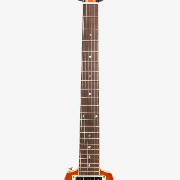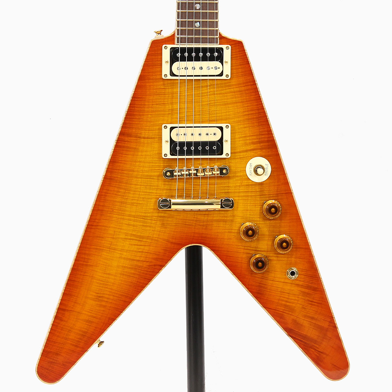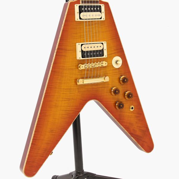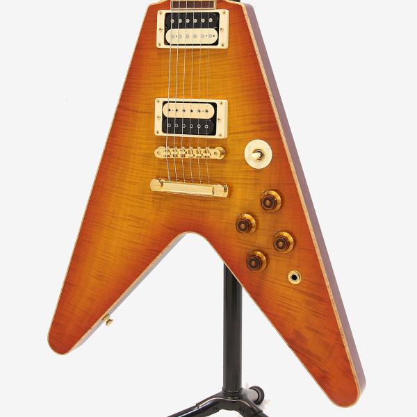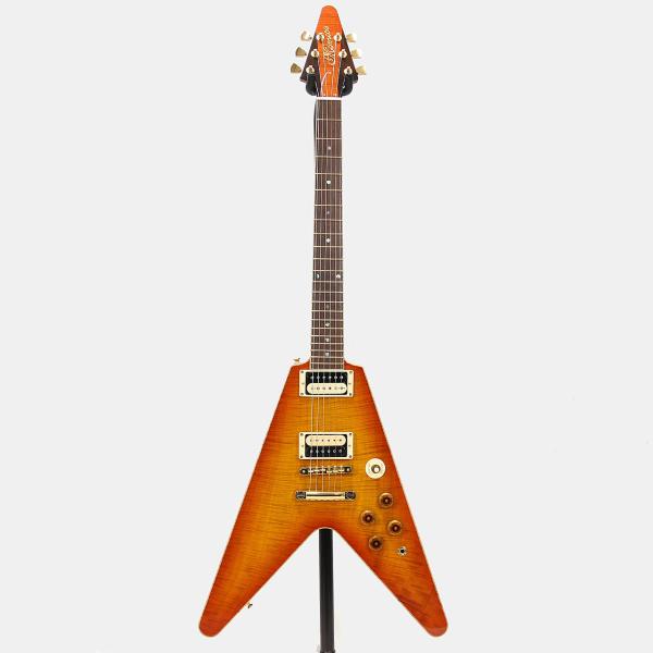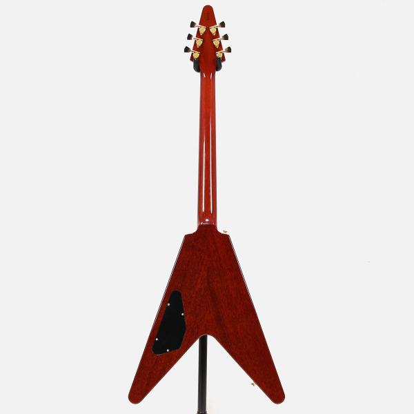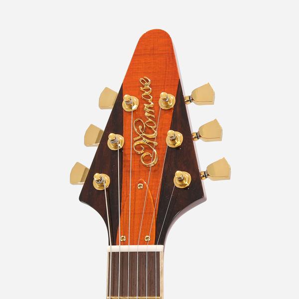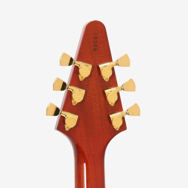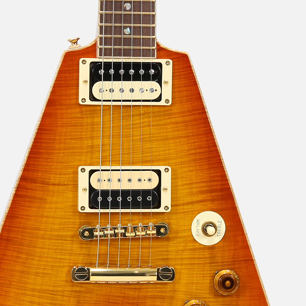 全体のルックスはフライングVモデルですがレスポールモデルの要素を組み合わせておりストップテールピースを使用したコンビネーションブリッジ、2Vo2Toのコントロールに加えMLSシリーズでお馴染みのヘッド突板などから、そのコンセプトを感じ取ることができます。カラーリングもMLSモデルの要素から来るバーストカラーで仕上げられており、ボディバインディング部分は着色を施さずクリアで表現するバインディングとなっており、高級感を感じる仕上がりとなっております。