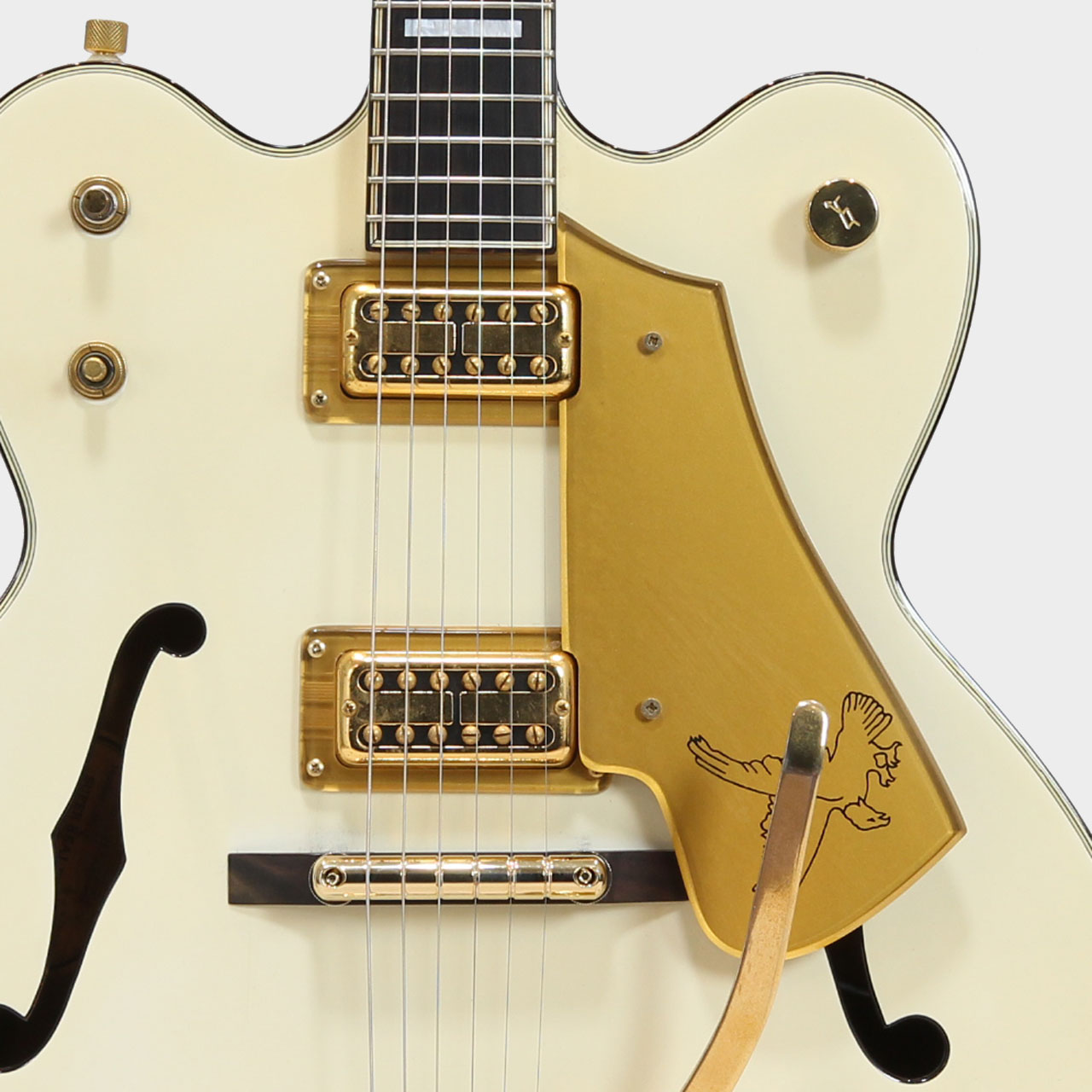 シリアルナンバーよりSuper Realシリーズラインナップ内でも激レアのホワイトファルコンを模した1本です。パーツもピックアップ等の電装関連はもちろん、なんとアームユニットもオリジナルと本機製造にあたっての当時の力の入りようがうかがい知れます。