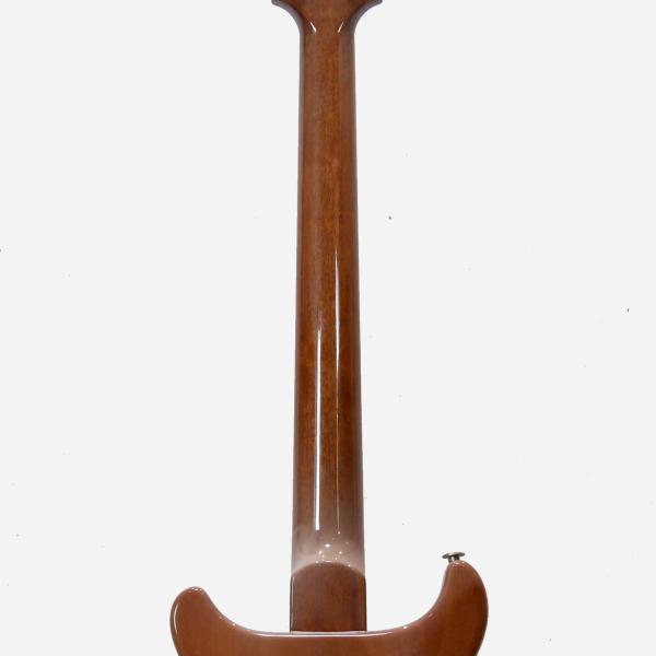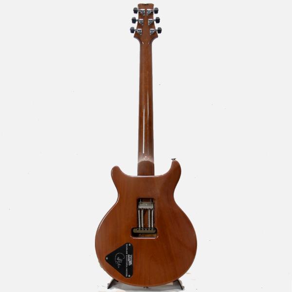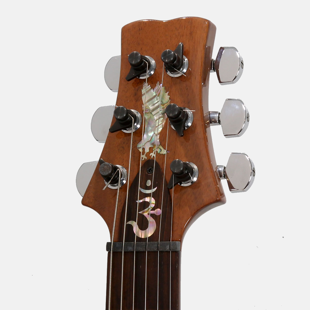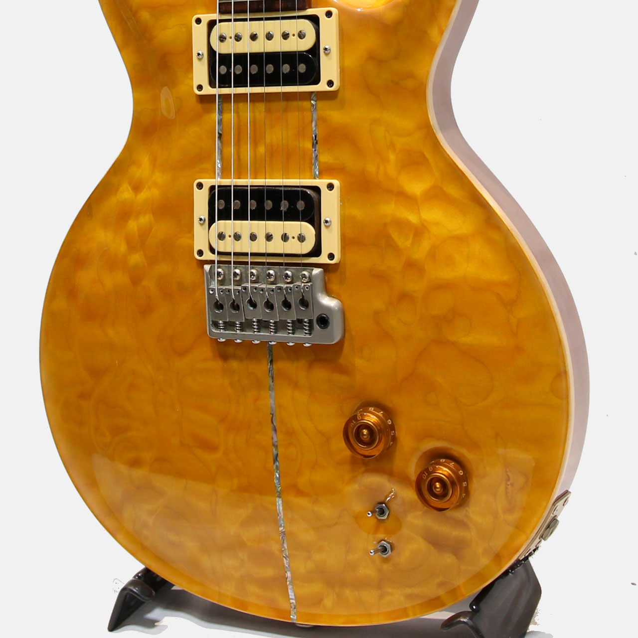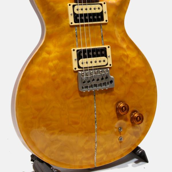 シンメトリーボディ、ピックアップON/OFFスイッチ、ヘッドのイーグルインレイ、氏のシグネイチャーモデルを象徴するオムシンボルの入ったトラスロッドカバーと随所にコダワリを散りばめた本モデル。キルトトップ、シンボリックなサンタナイエローで仕上げた1本です。