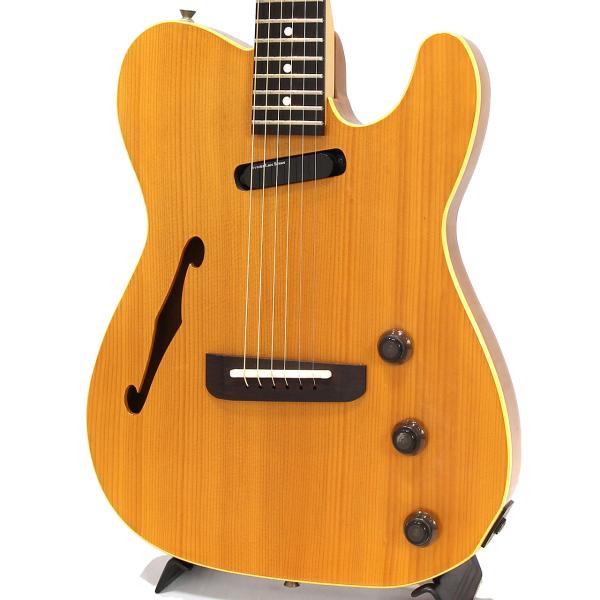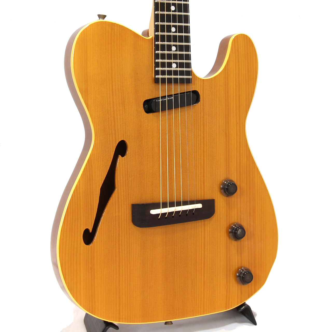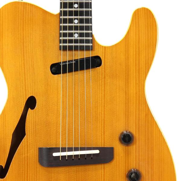生鳴りはシンラインと同じ程度ですがラインサウンドが非常にユニーク。コントロールは1ボリューム、1トーン、バランサーでレースセンサーとピエゾをミックスした独特のサウンドが楽しめます。どちらかに振り切ることでセミアコっぽい暖かみのあるサウンドからアコースティックなアタック感のあるサウンドまで幅広い音作りが可能。アコースティック弦でセットアップしていますがエレキ弦を張ってみるのも一興です。