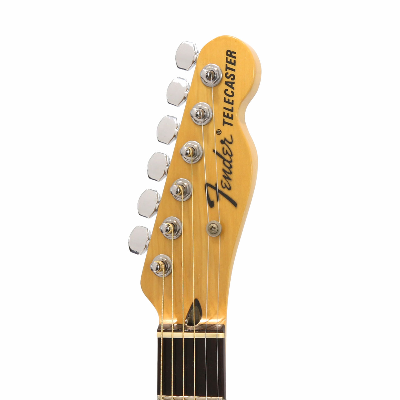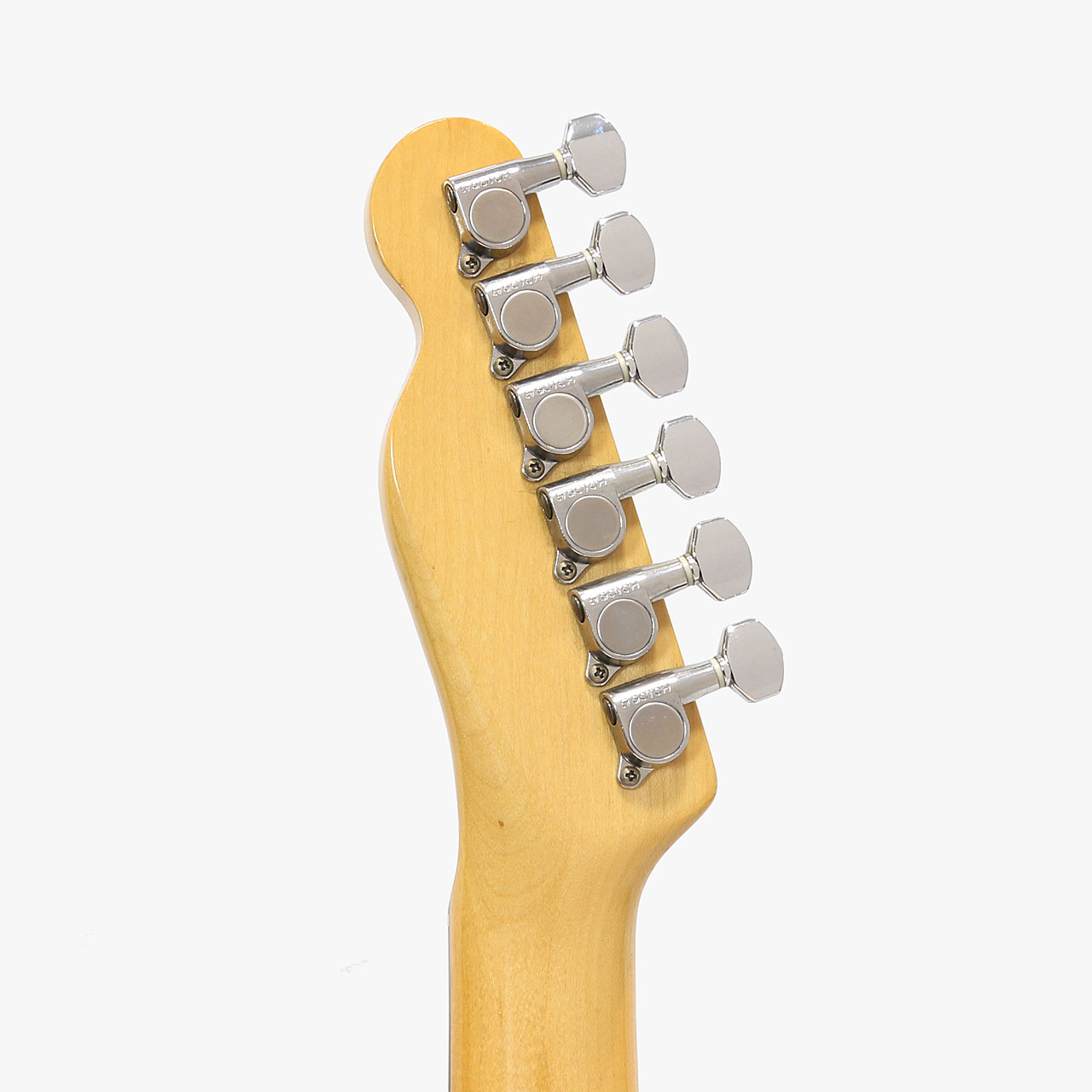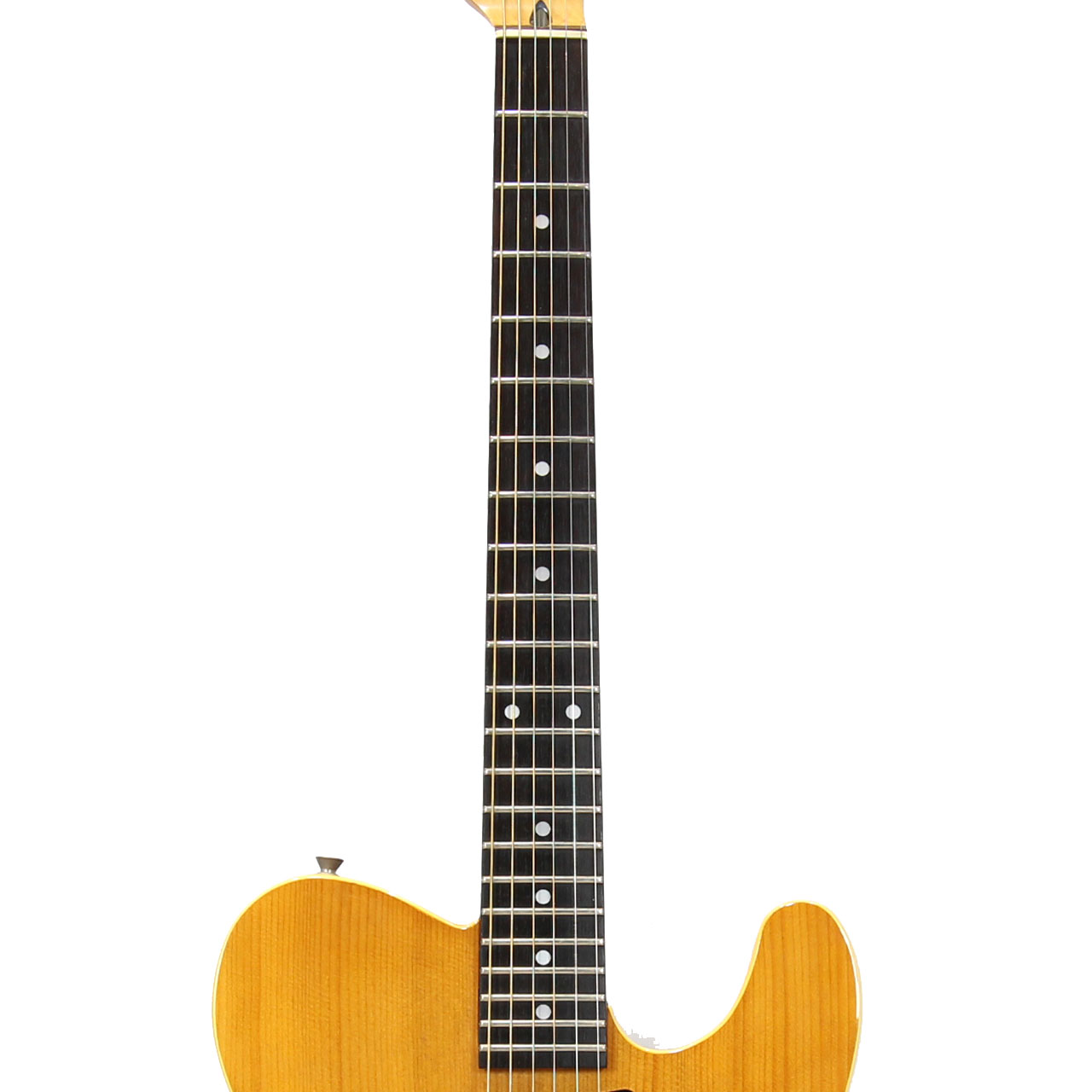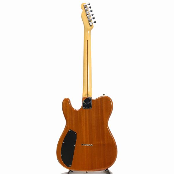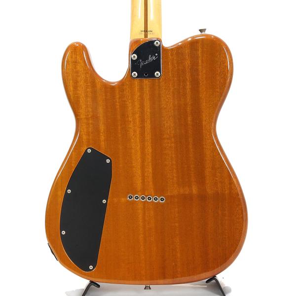 テレキャスターシェイプにスプルーストップ、マホガニーボディ、メイプルネック、ローズウッド指板&ブリッジ、ゴトーペグ、レースセンサー&アンダーサドルピエゾピックアップ。