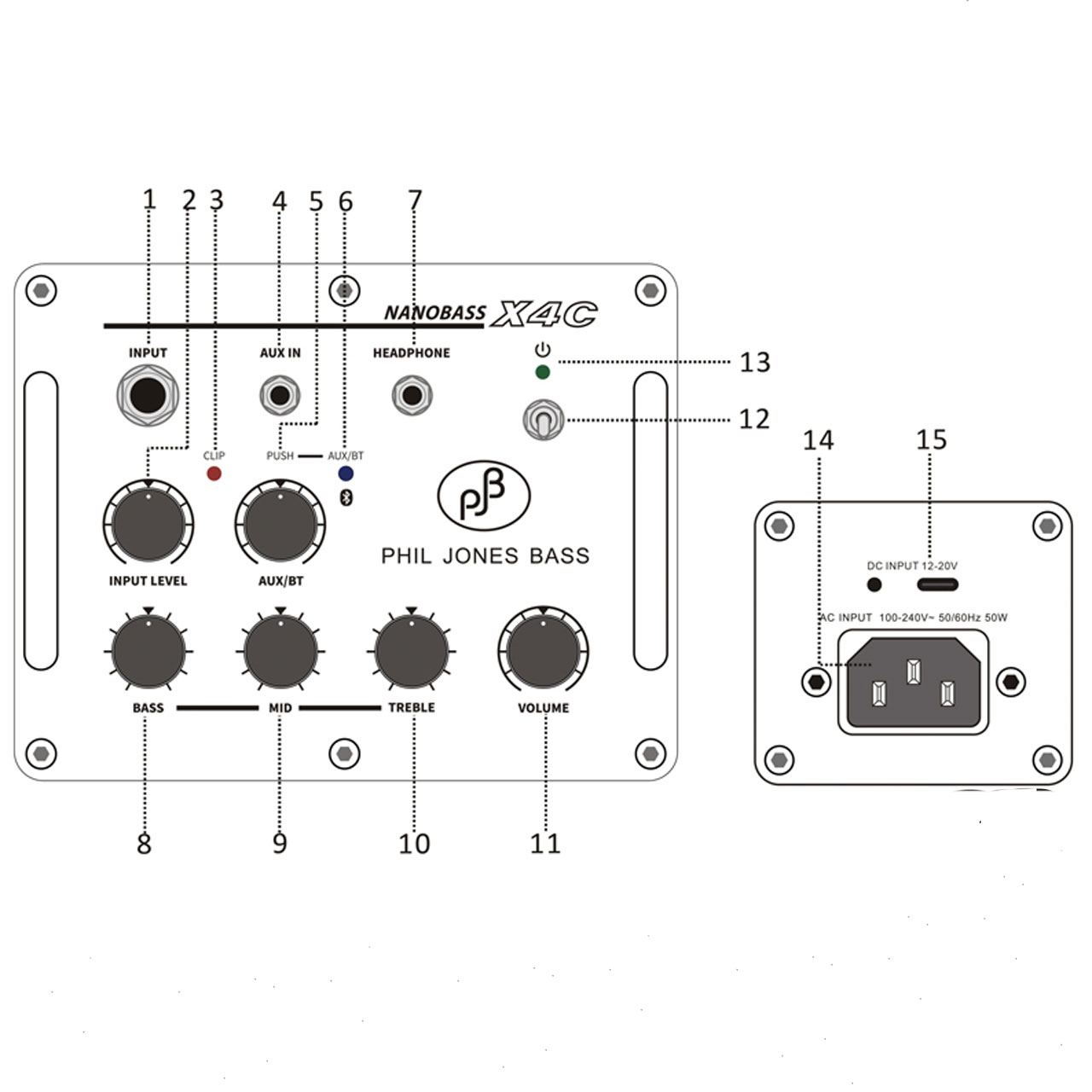 ■コントロール: Input Level、Bass、 Mid、 Treble、 AUX/Bluetooth Volume、 Master Volume ■入出力端子: インプット、AUXインプット、ヘッ ドホン アウト