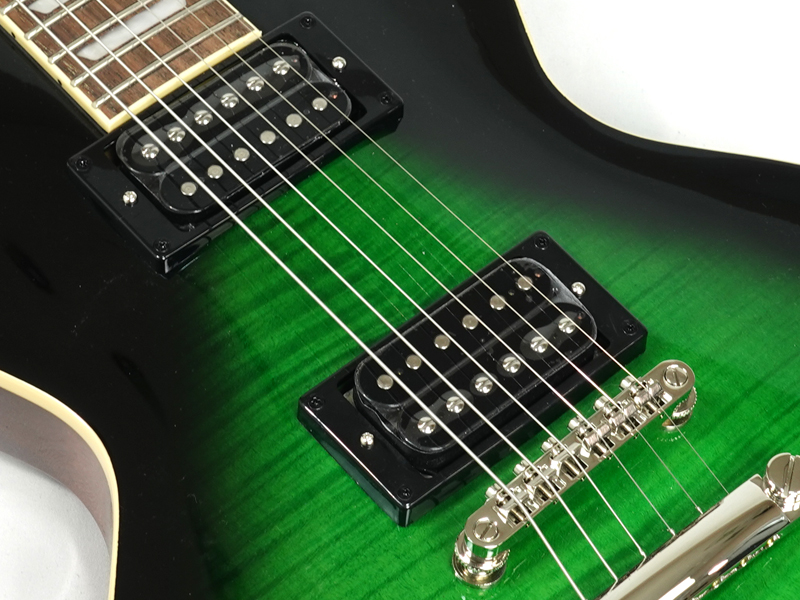 AAAのフレイムメイプルトップに鮮やかなアナコンダバースト。お馴染みのノンピックガード、こちらはゼブラのオープンハムバッカーと存在感は抜群です。