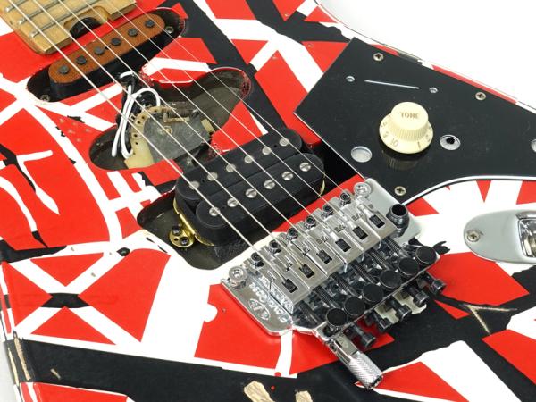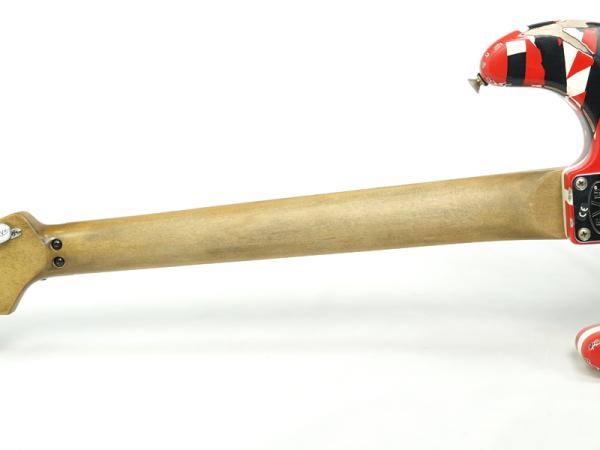 エディの有名な赤に白と黒のストライプのデザイン、そして激しく使い込まれたような擦り切れた外観を持つ本製品は、バスウッドのStratocasterスタイルボディとグラファイトで補強された柾目メイプルネックが特徴です。ネック裏にはオイル仕上げが施されており、何時間でも快適に演奏できる優れたプレイアビリティを提供します。また、22ジャンボフレットを備えた12インチ?16インチコンパウンドラジアスメイプル指板は、スピード感のある激しい演奏スタイルに対応できるようにデザインされています。