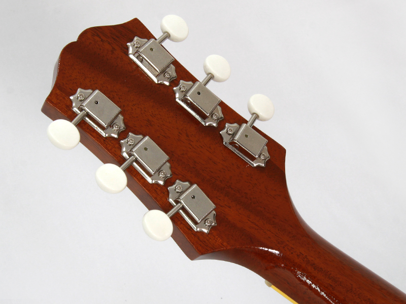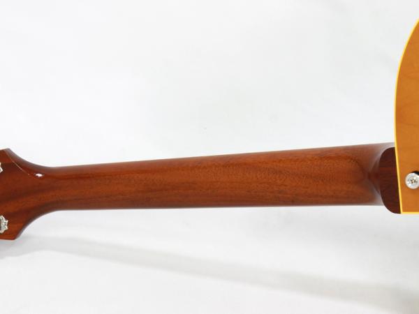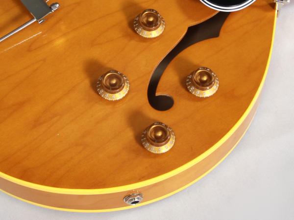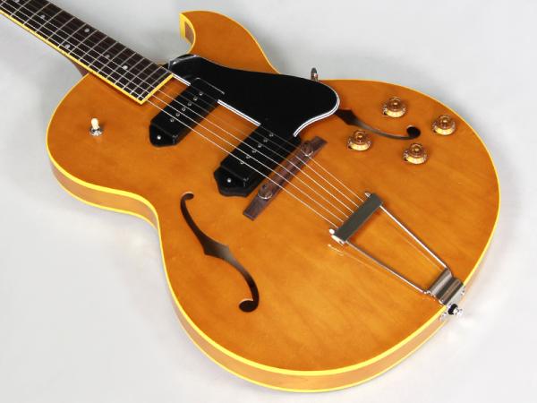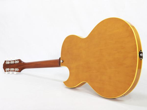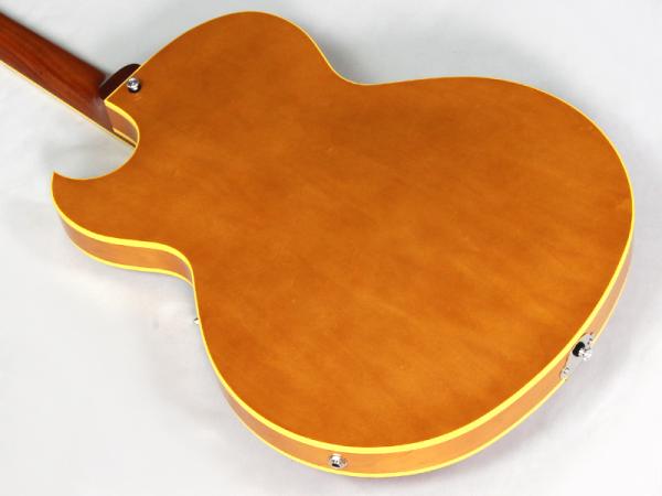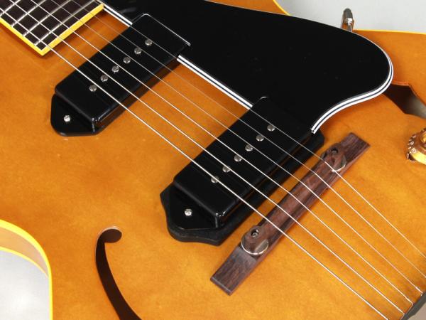 これにより通常のフルアコでは得る事の出来ない独特なサスティンと良質なコンプ感を伴うサウンドの腰の強さが増しクランチに歪ませた設定でも十分に対応出来る。セミアコとフルアコの中間的な頃合いの良いところに収めたサウンドと言えます。また、塗装は極薄ニトロセルロースラッカーフィニッシュで仕上げられおり、ボディやネックの持つ「木の鳴り」をダイレクトに響かせ見た目も荒めの仕上げでワイルドかつ高級感漂う独自の質感となっております。
