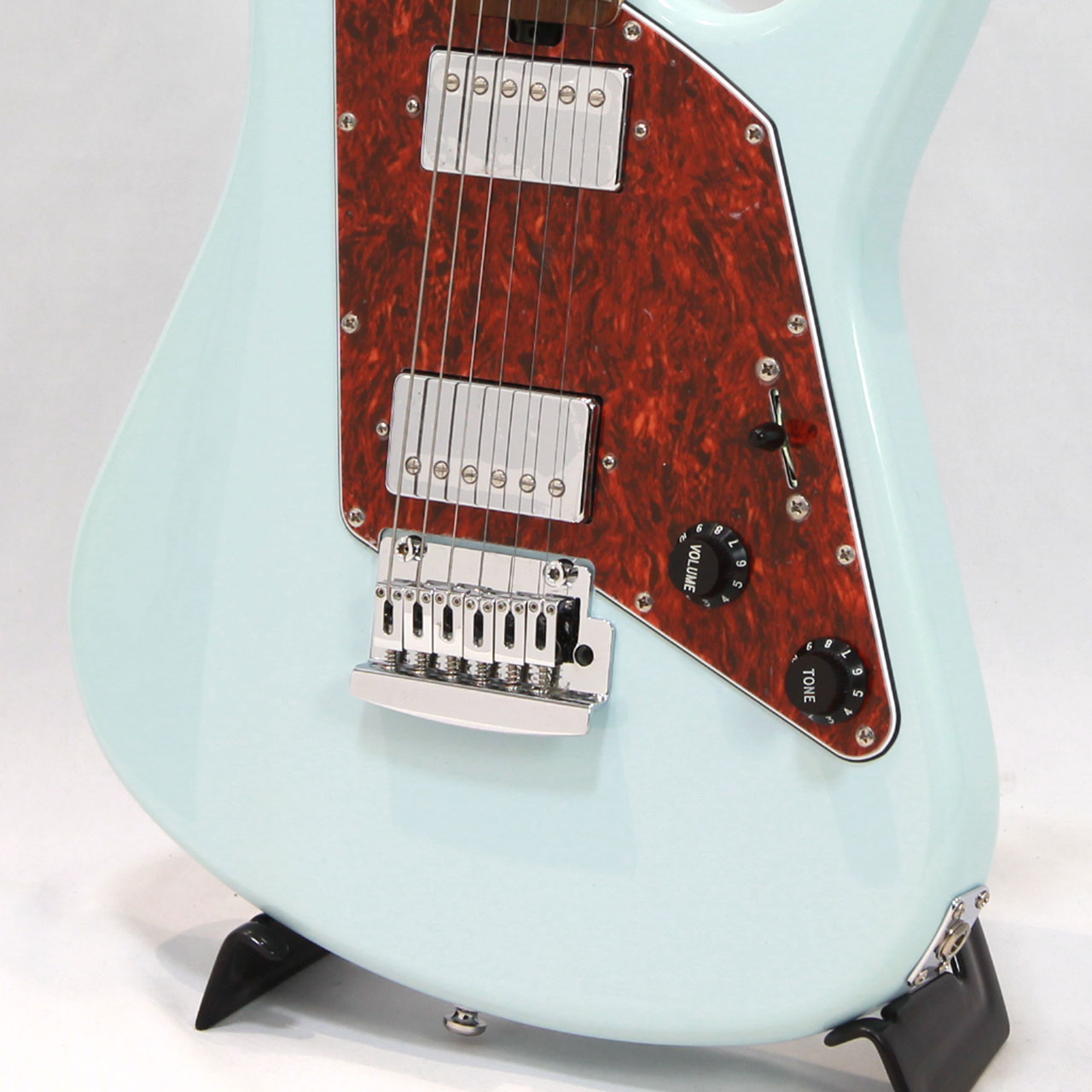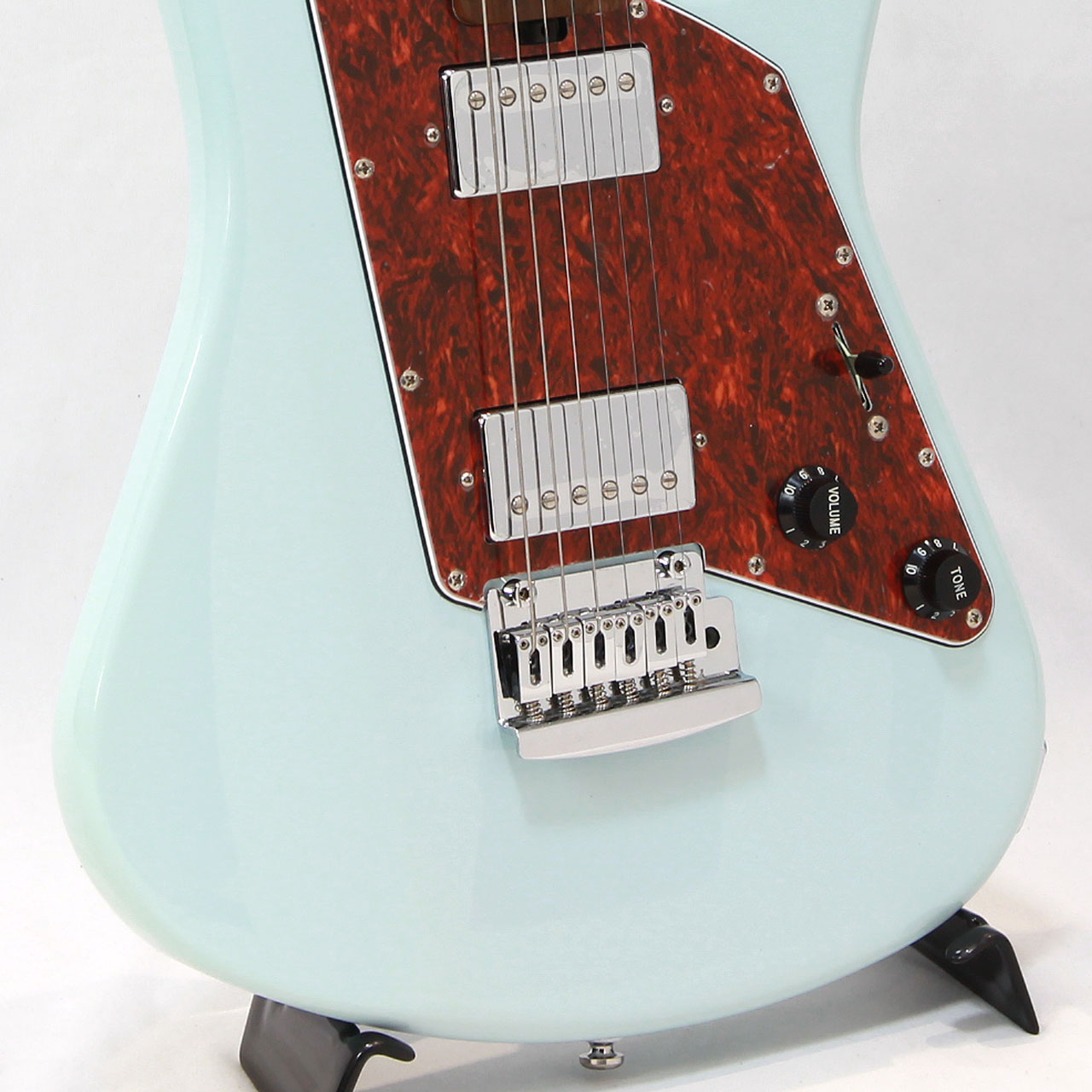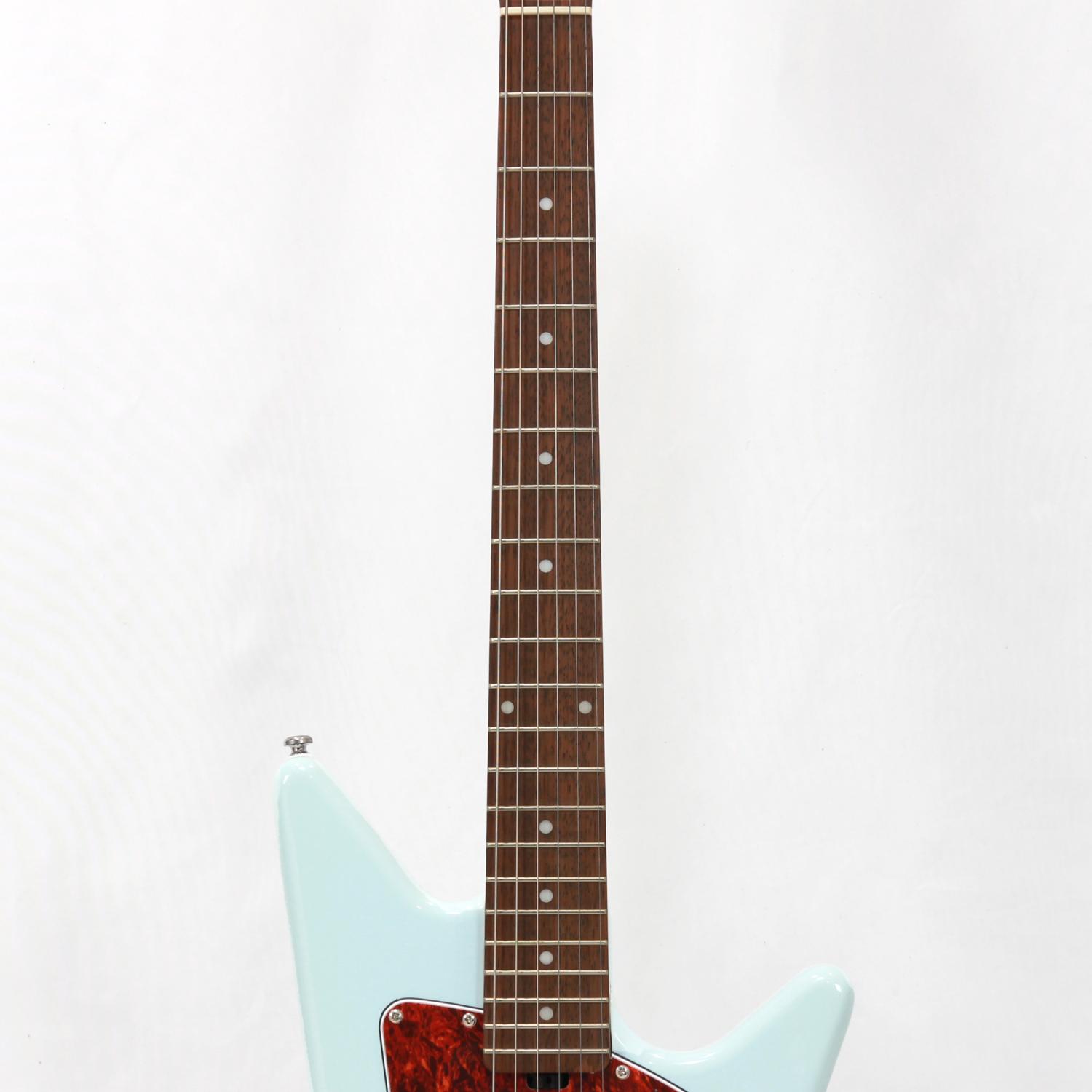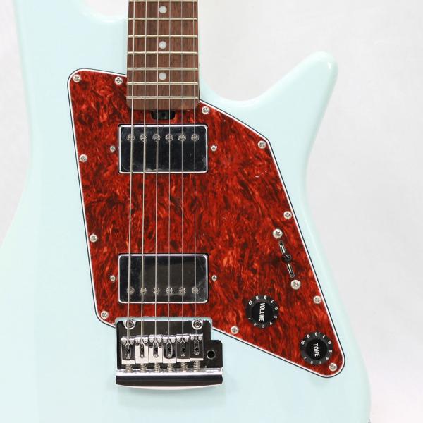 レトロ感のあるボディシェイプとピックガード、カバードのハムバッカー、ポップなダフネブルーですがどこかビンテージ感漂うルックスも個性的です。