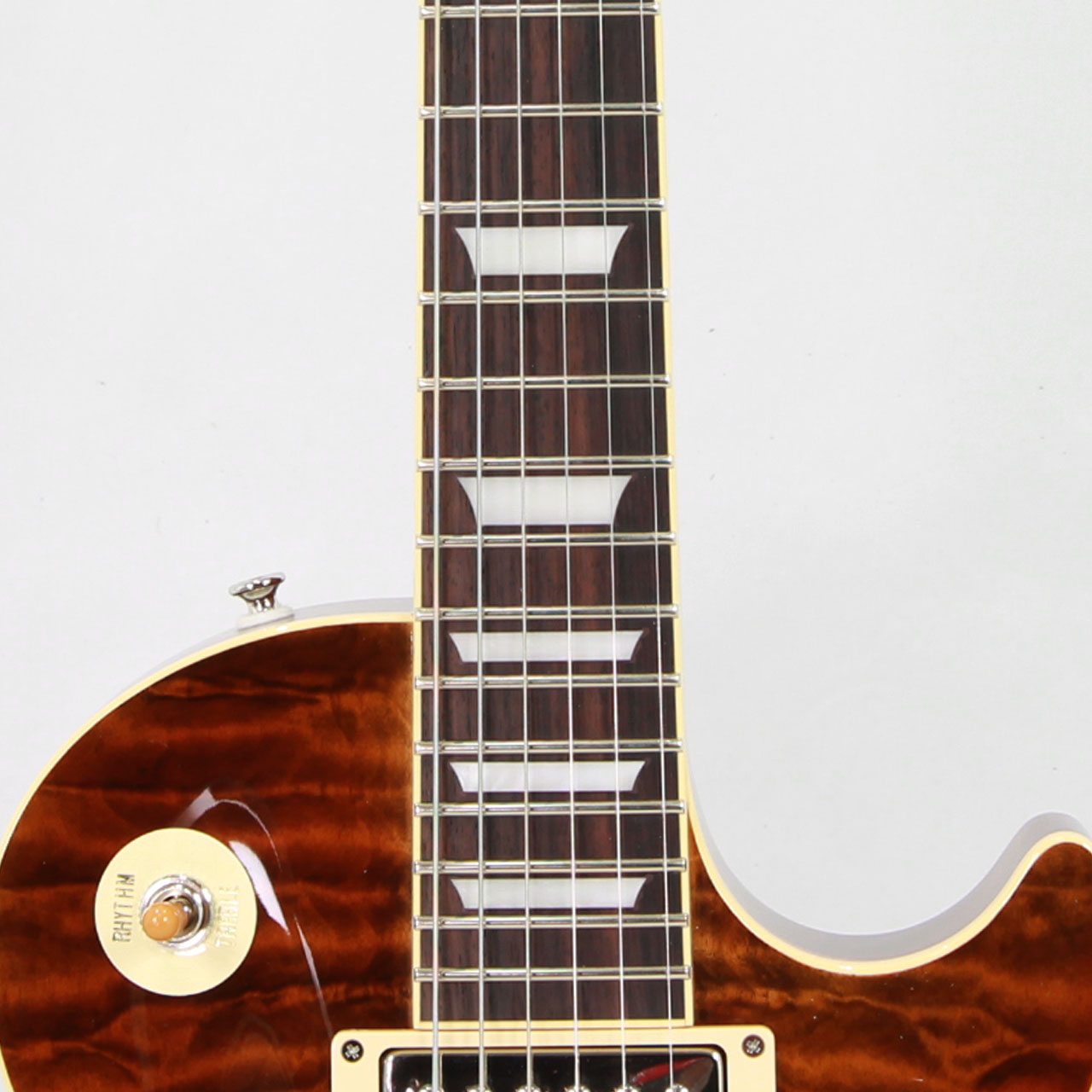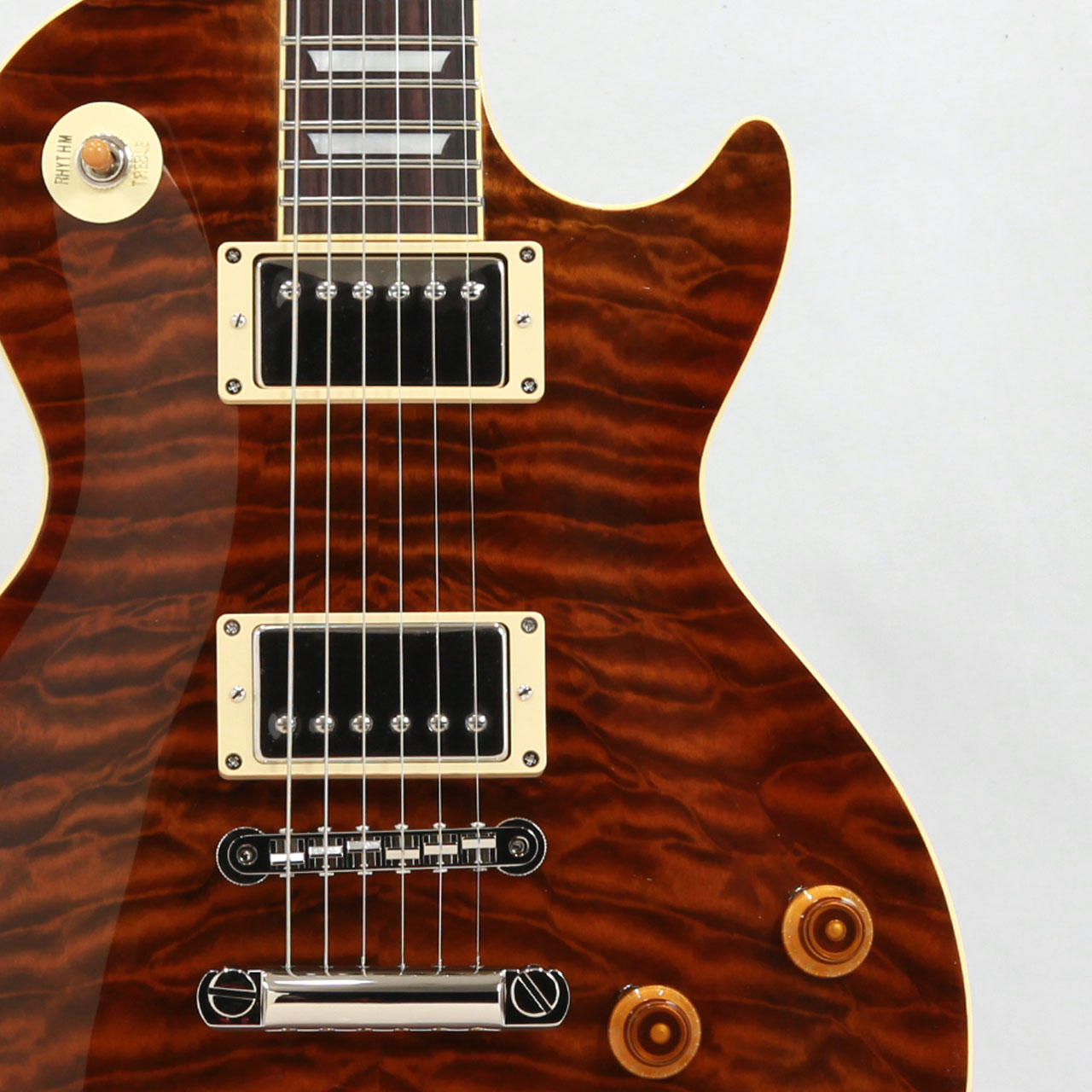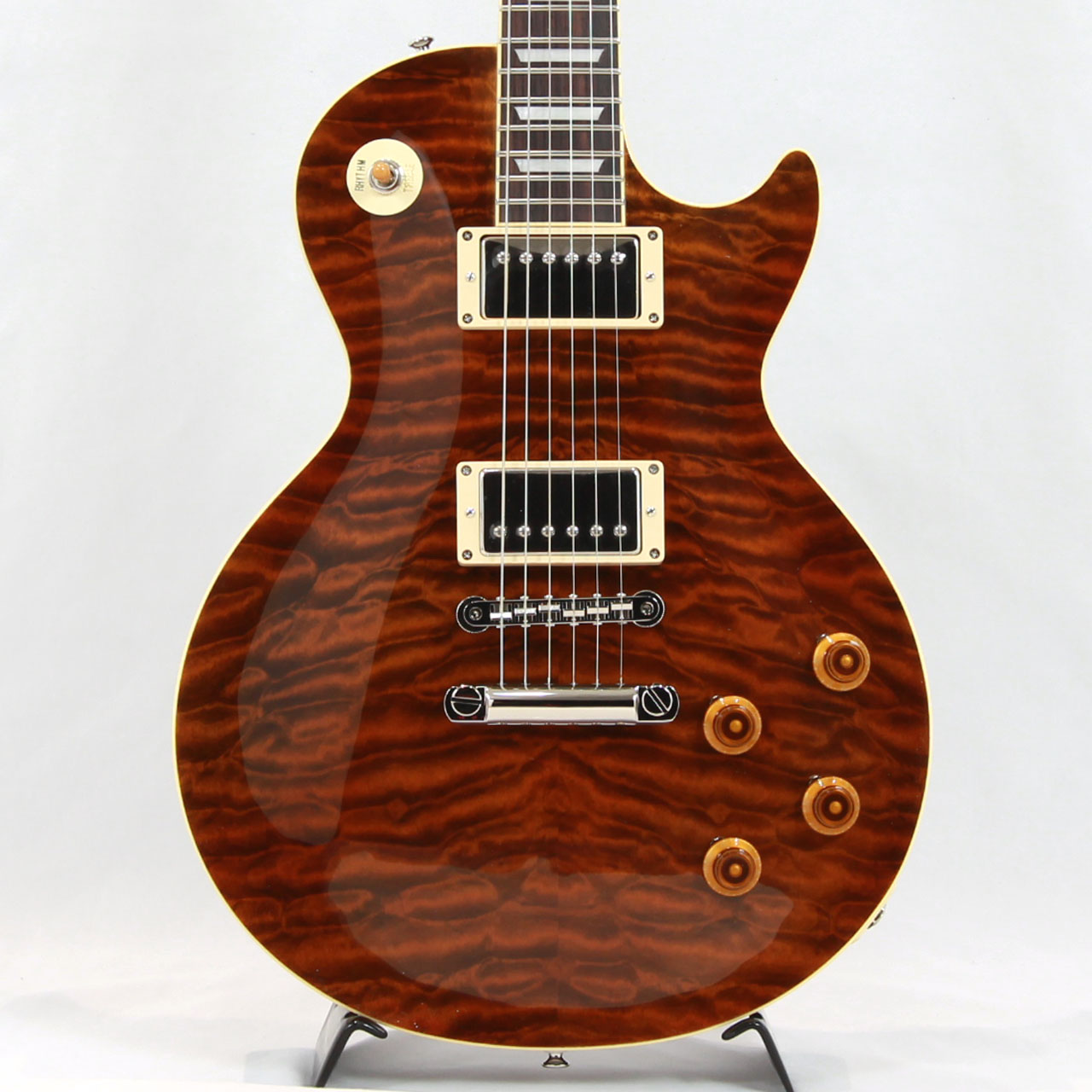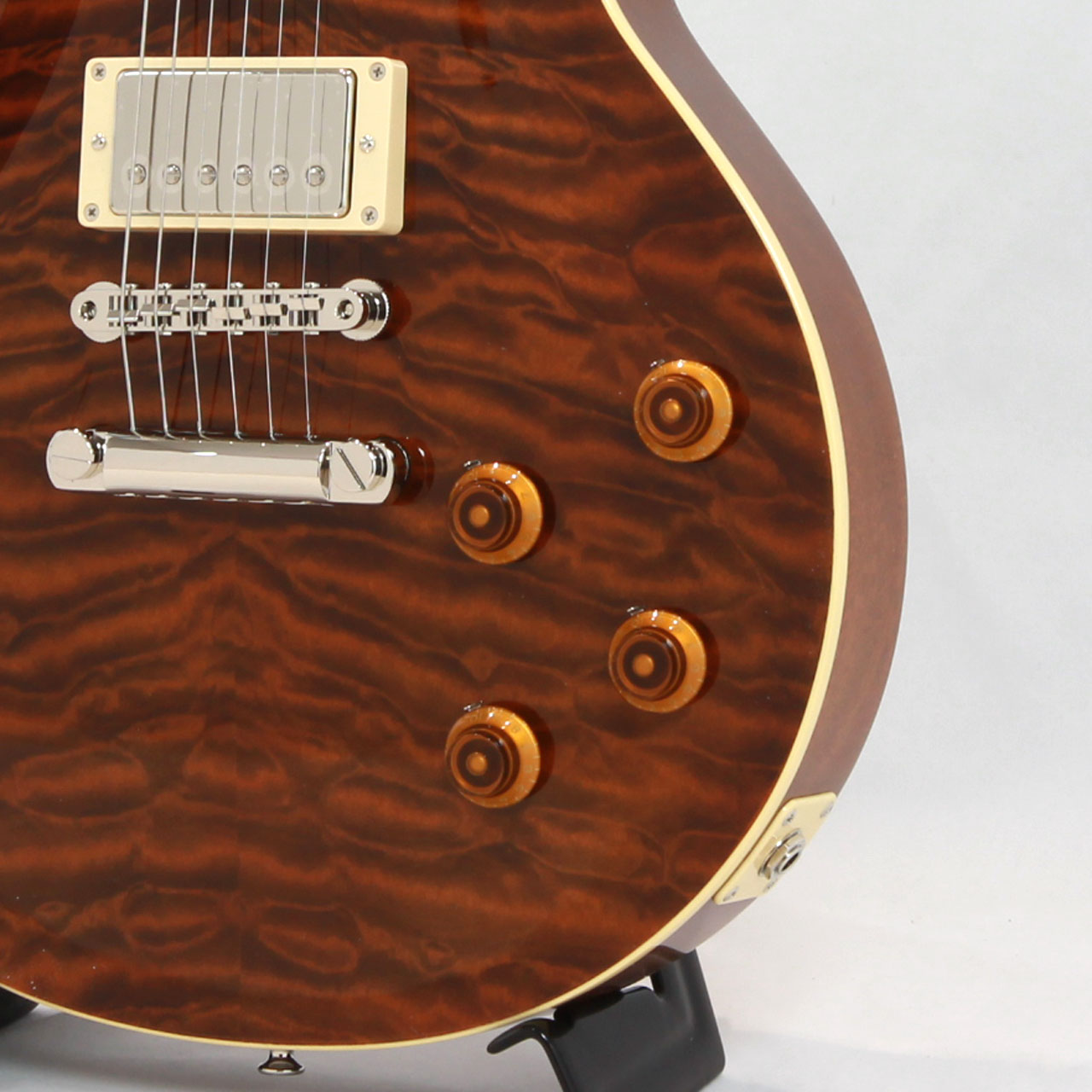 GIBSONレスポールスタンダードを忠実に再現し、トップ材に美しいキルテッドメイプルを採用。美しさと分厚いサウンドは本家GIBSONに負けない完成度です。杢目を活かしたルックスでピックガードを外しています(ピックガードは付属します)