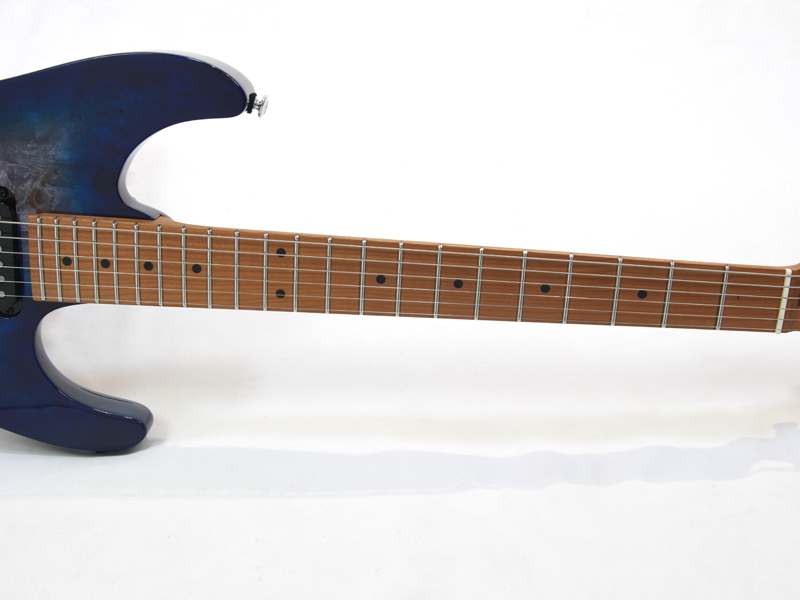 GOTOH製マグナムロックペグ、シンクロトレモロ、ステンレスフレット、ボディのコンターやネックジョイント部の球面仕上げ、蓄光素材のサイドポジションマークなど現代的な演奏性の高さを求めてひと手間ふた手間かけた拘りの感じられる一本。