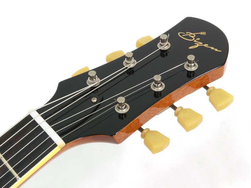 そして、ネックのシェイピング。これが非常に絶妙でハンドシェイプで最終の仕上げが行われているのは当然なのですがネックの頂点がやや6弦側にシフトされております。これにより特にハイポジションの1弦から4弦へと弦移動していく様なシビアなソロプレイにおいてスムーズなフィンガリングと豊かなサスティンを確保してくれます。独特なカーブを持つボディバックコンターやハイポジションのヒールレス加工といった細やかな配慮もBizenの特徴ですがこのネック仕上げによる弾きやすさに感動しました。この弾き心地はBizenでしか体感できません。ギタープレイにおいて新たな境地を体感いただけると思います。