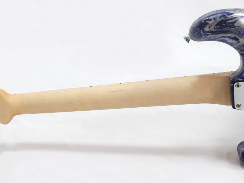 クウォーターソーン(柾目)ネックは剛性のあるガッシリした鳴り。今回運よく、うっすらとフレイム杢が浮き上がっているところもポイントです。
