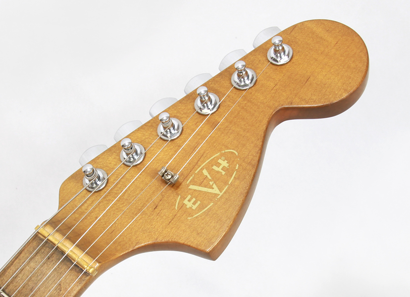 "TONE"とラベリングされたホワイトのストラトスタイルボリュームノブ、トレブルブリード回路付き500K EVH Bourns®ローフリクションポット、ブラックピックガード、クロムハードウェア、オーバーサイズストラップボタン、EVHネックプレート、ゴールドEVHロゴの付いた70年代スタイルのFenderストラトキャスターヘッドなどの特徴を備えています。