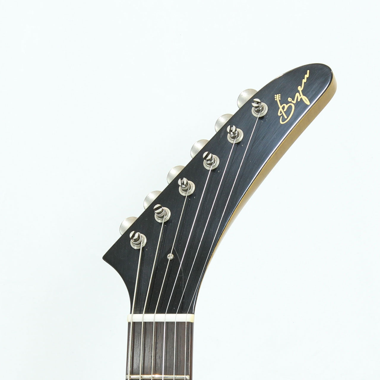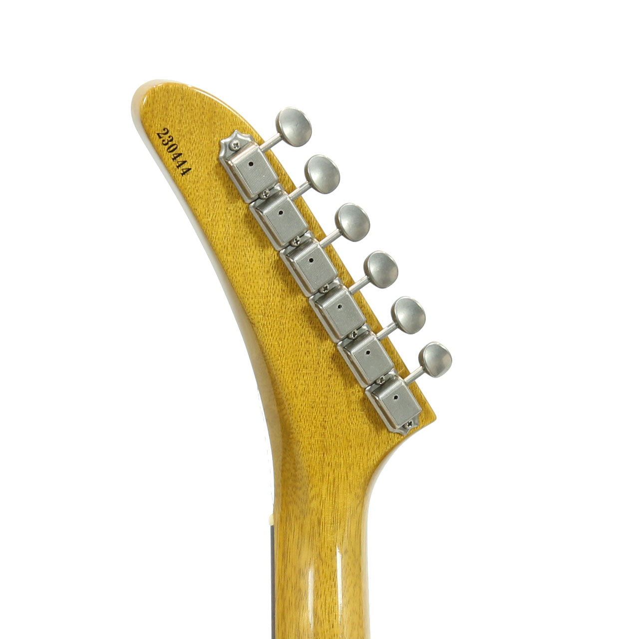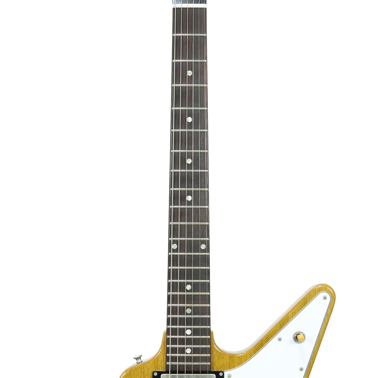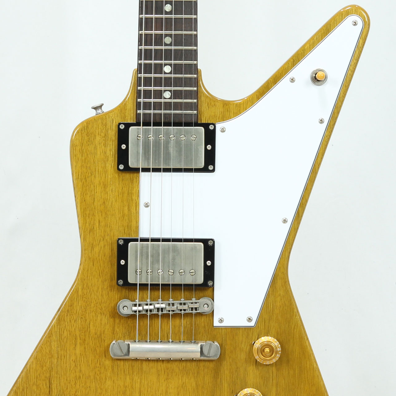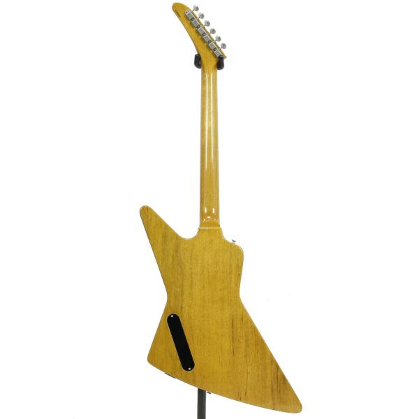 いわゆるコリーナエクスプローラーモデル、多くのレジェンドギタリストの愛用で多く知られている1本です。伐採地が限定され、トーンウッドとして知られるコリーナ。トータルウエイトは3.455Kgと重すぎず軽すぎずの良いウエイトと思います。軽量なコリーナらしい絶妙のサスティンとリッチな中域、ハカランダ指板による木琴の様な絶妙なコンプ感は極上のトーンです。ピックアップの出力も絶妙のヴィンテージスタイルですが枯れすぎずなトーンなので守備範囲も広く、様々な場面で多彩な表現が可能です。ドライブ時のキレの良さ、クリーンカッティングのコンプ感がたまらないですね。