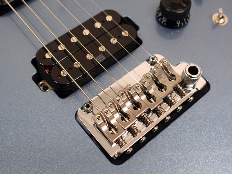 GOTOH製マグナムロックペグ、シンクロトレモロ、ステンレスフレット、ボディのコンターやネックジョイント部の球面仕上げ、蓄光素材のサイドポジションマークなど現代的な演奏性の高さを求めてひと手間ふた手間かけた拘りの感じられる一本。