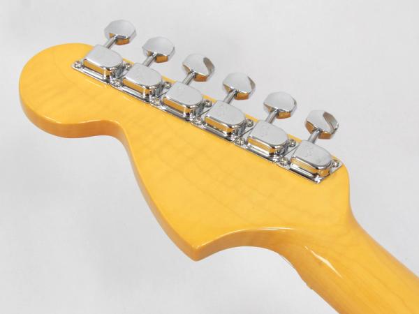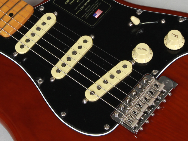American Vintage II 1973 StratocasterはPure Vintage '73 Staggered Poleピックアップを3基搭載しデュアルストリングツリー仕様のラージヘッドストック、ヘッドに配置された便利なBulletスタイルトラスロッドナット、Micro-Tilt付きの3ボルト式ネックプレートなどを装備しています。1973 “C”シェイプのメイプルネックに21本のヴィンテージトールフレットを配した7.25インチラジアスのメイプルまたはローズウッド指板を採用し、まるで1973年に舞い戻ったかのような当時の楽器の演奏性を彷彿させます。