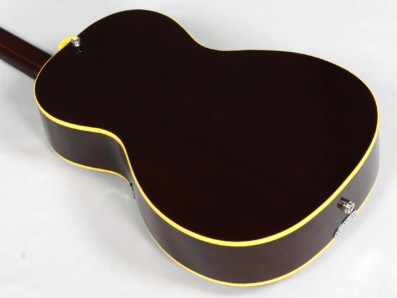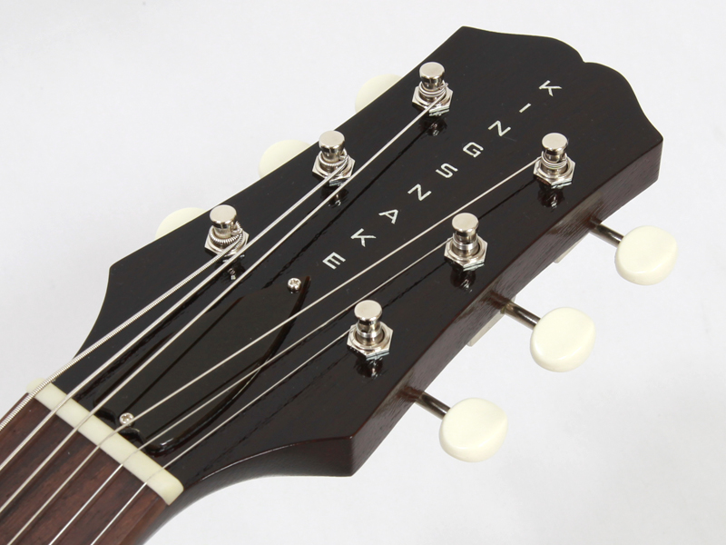 トップ材にはスプルース単板、マホガニーボディ深胴&フラットバックを採用しふくよかさと上質なアコースティックトーンを獲得。通常のラッカー塗装の塗膜厚よりも薄い木部下地の目止めの無い極薄ニトロセルロースラッカーフィニッシュを施し、ボディ/ネックの持つ「木の鳴り」をダイレクトに響かせ、見た目もワイルドかつ独自の質感となっております。それにブリッジ下部にKING SNAKE独自のDetroit One Blockという名を冠したスプルースブロックを配する事で音の芯が増し、ブルージートーンのながらもスピードのあるサウンドとなっております。