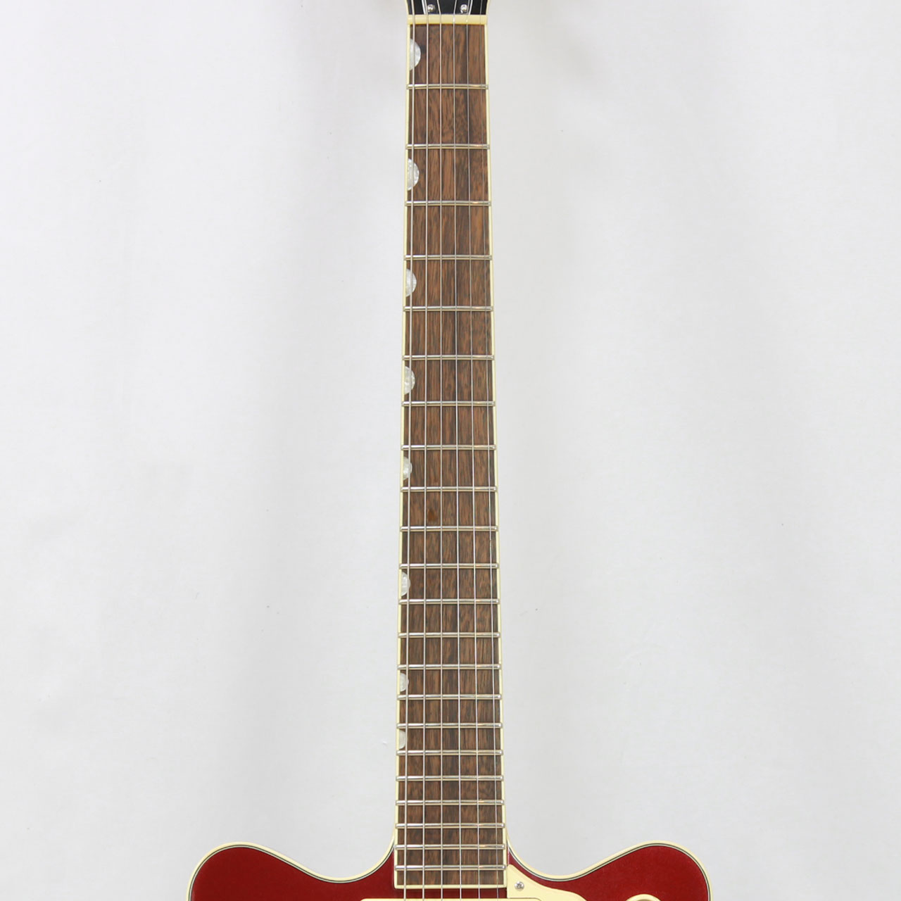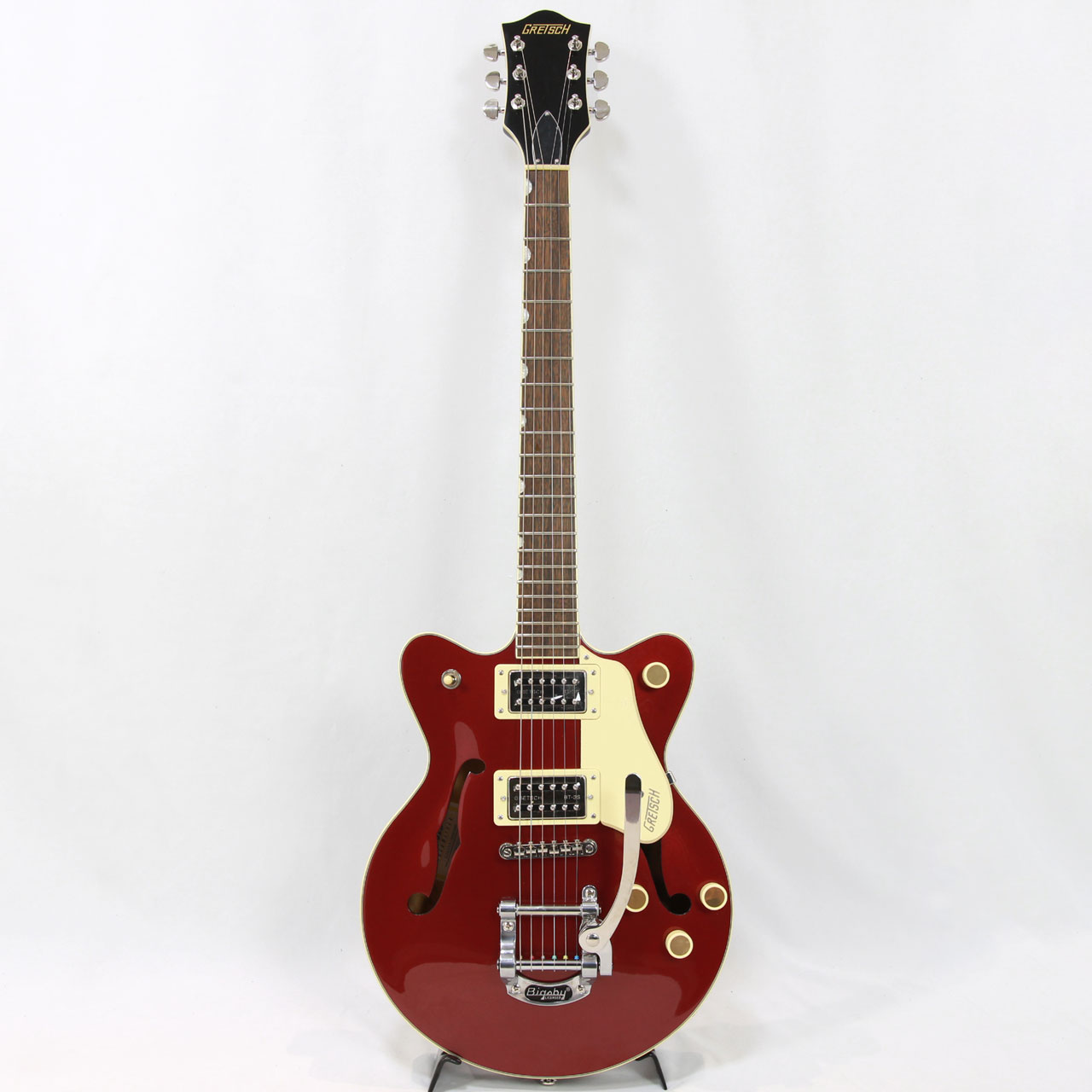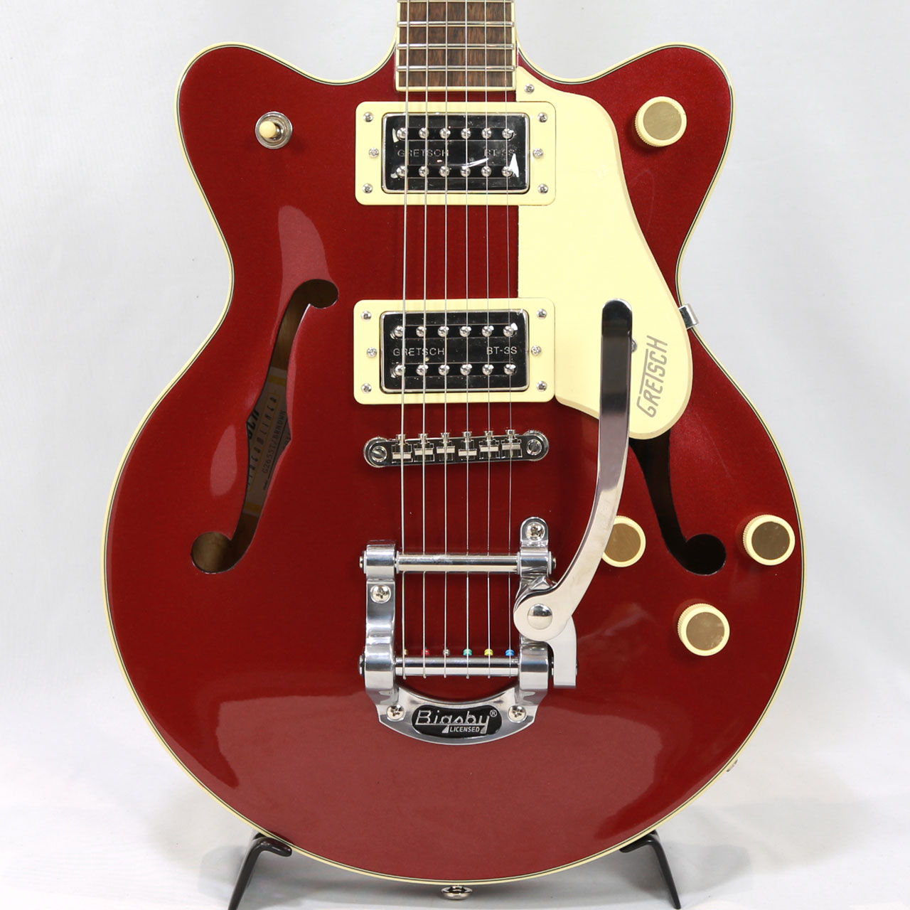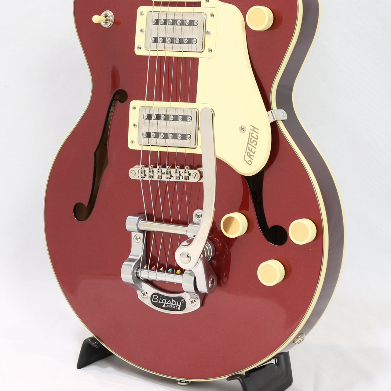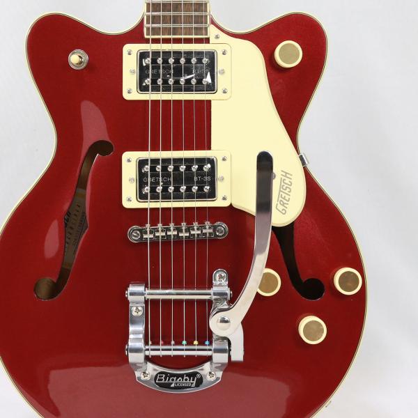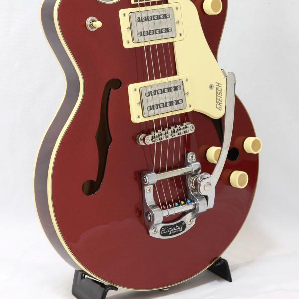 Gretschならではの高いデザインセンスはそのままにコンパクトに仕上げたボディサイズ。小さめのアーチドメイプルボディに新たなセンターブロックデザインを採用し軽量で快適な演奏性と存在感のあるリッチなサウンドを両立するように設計されており、アタックとサスティンを向上させております。軽量で取り回しも非常に良く、抱え込みもしやすいので長時間のプレイや小柄な方にもオススメです。ビグスビーもオシャレですね。