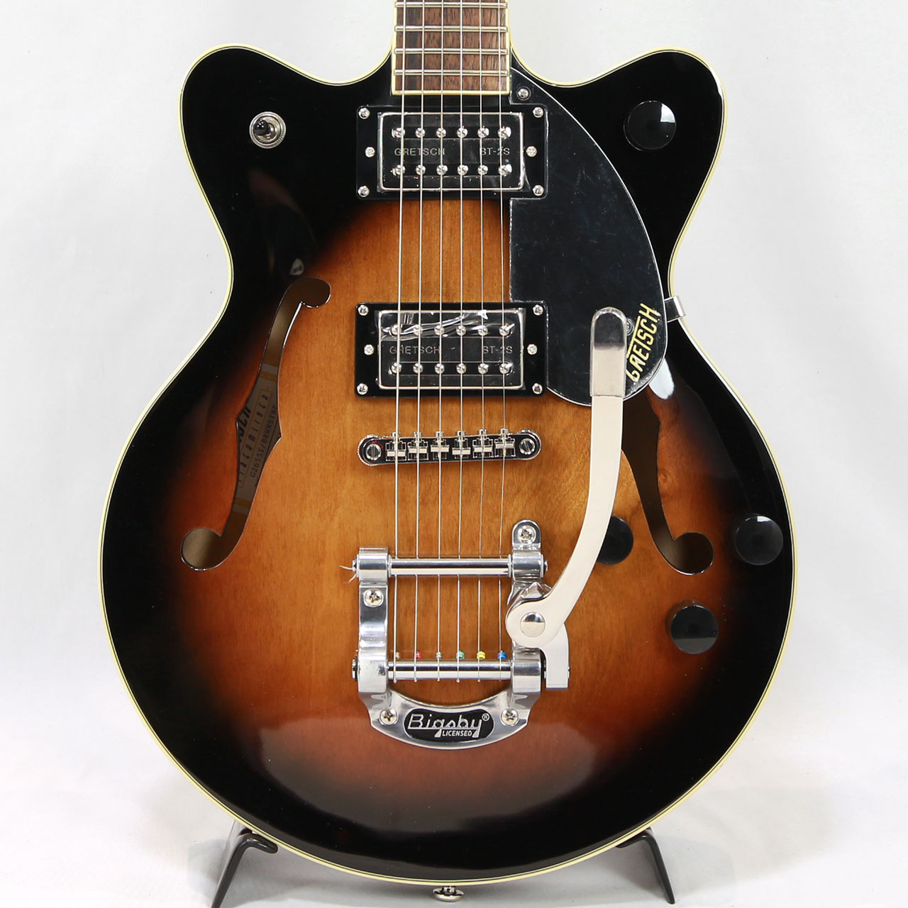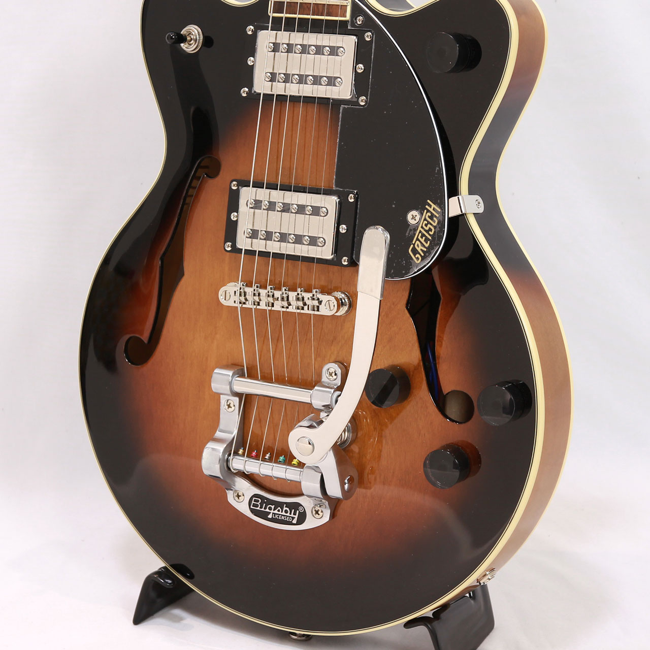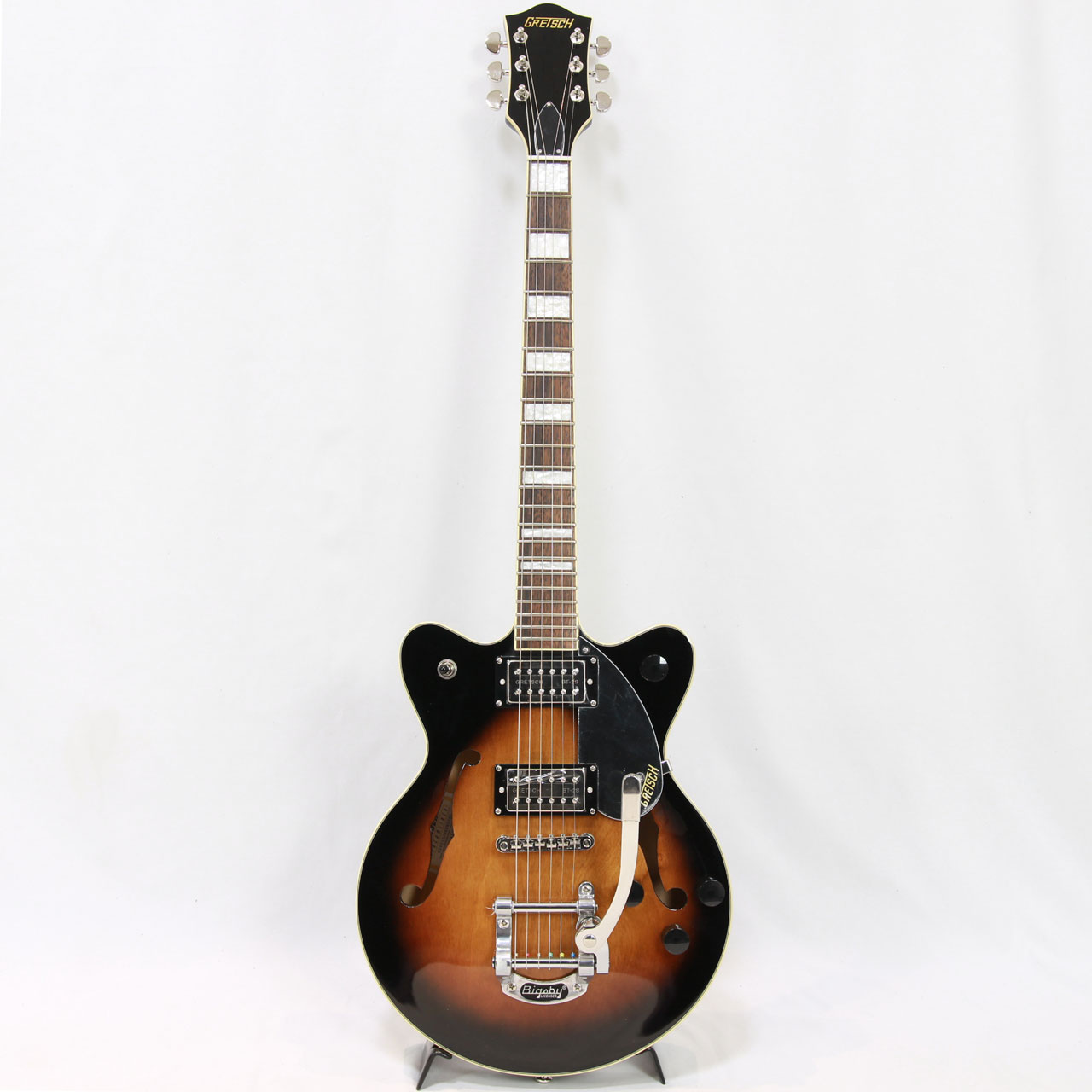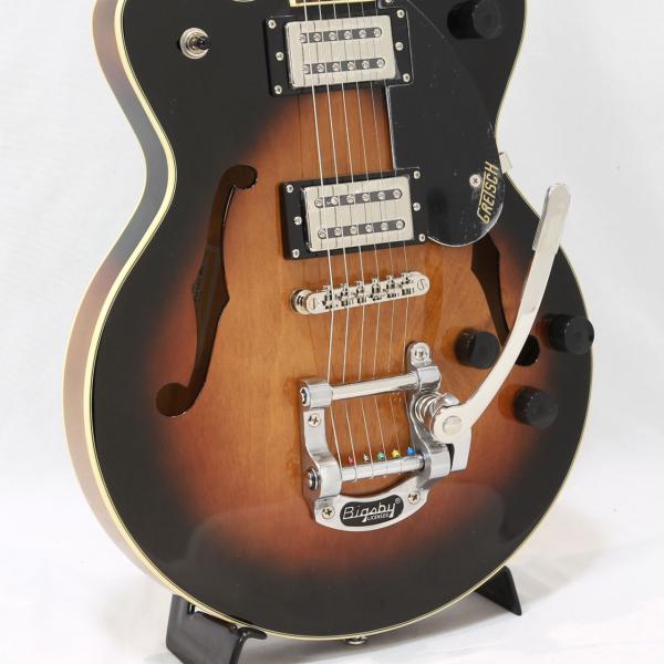 Gretschならではの高いデザインセンスはそのままにコンパクトに仕上げたボディサイズ。小さめのアーチドメイプルボディにスプルースセンターブロックを採用しバランスの良いサウンドを獲得しております。軽量で取り回しも非常に良く、抱え込みもしやすいので長時間のプレイや小柄な方にもオススメです。ビグスビーもオシャレですね。