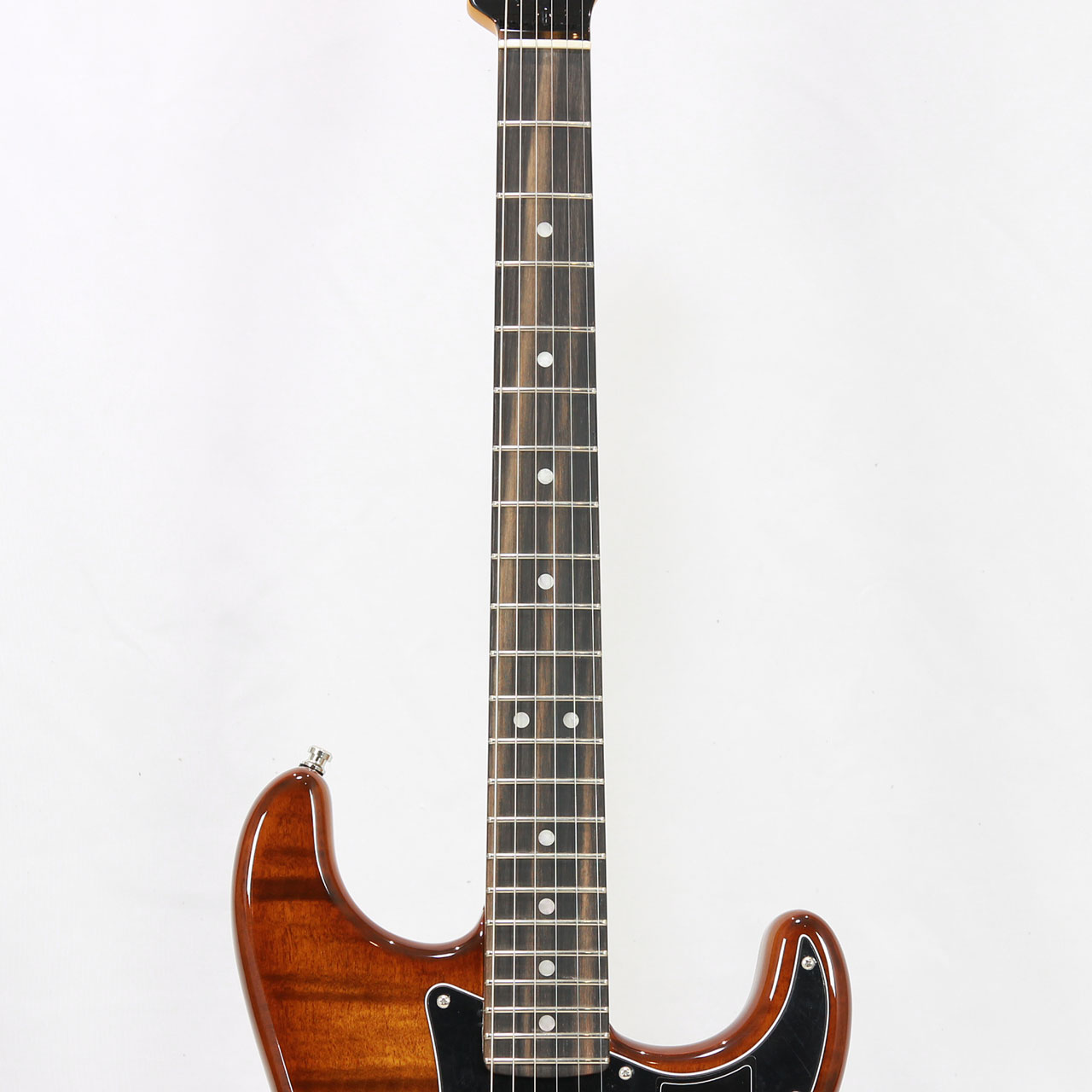 フレイムメイプルトップを美麗なタイガーアイカラーに個性的な杢目を持つStreaked Ebony指板で仕上げた1本です。
