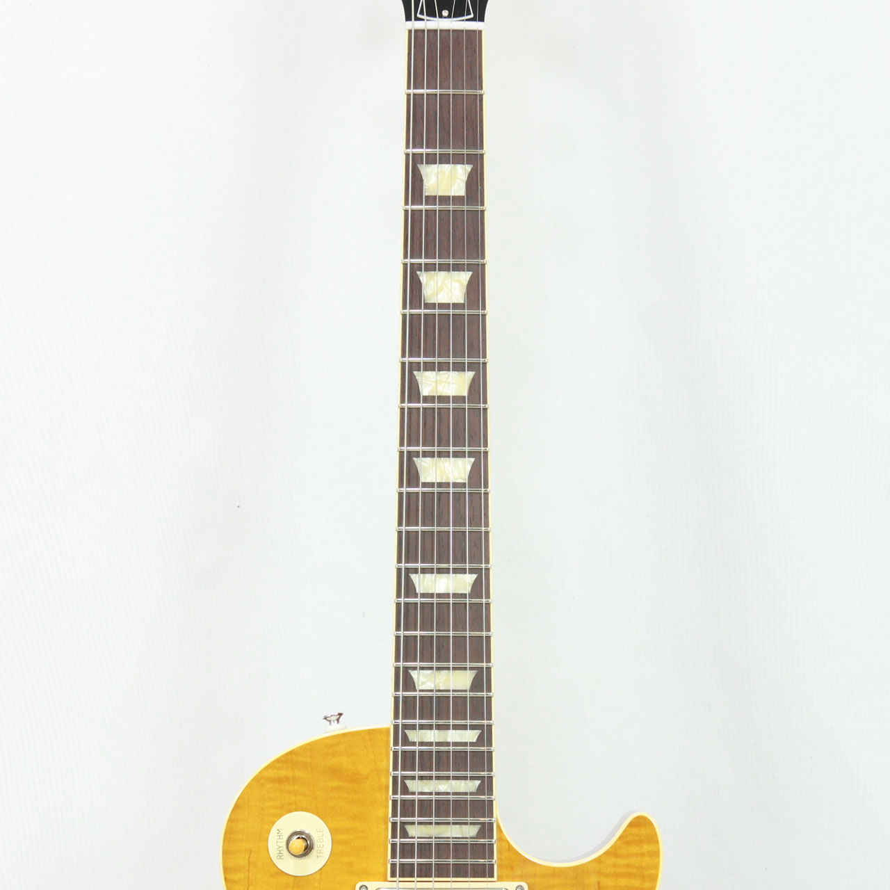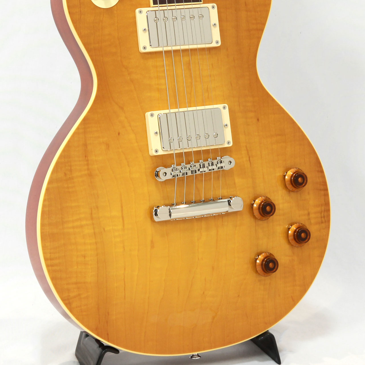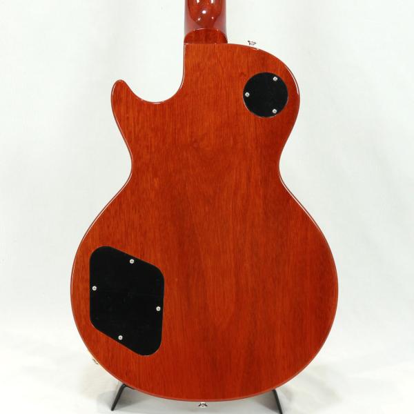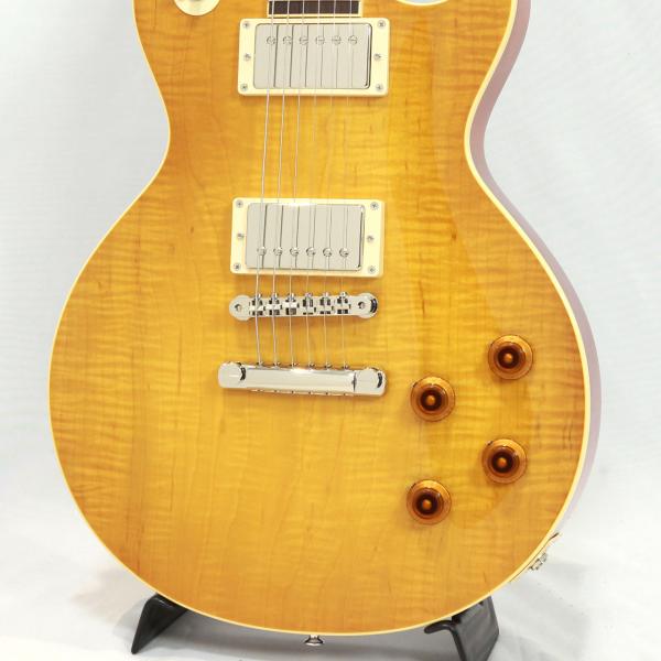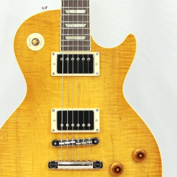 控えめなフレイムと特徴的な杢目をしたメイプルトップにボディバックとネックにはヴィンテージLPを語る上で外せないホンジュラスマホガニーを採用しサウンドのブラッシュアップが図られております。指板にもブラジリアンローズウッドの代替材として重宝されるマダガスカルローズウッドをチョイス。マダガスカルローズウッドも希少性と材の高騰で近年採用するメーカーが減ってきましたね。インディアンローズウッドに比べて目の詰まりがあり、程よいコンプ感で上品な高域のヌケ感が心地よいトーンです。