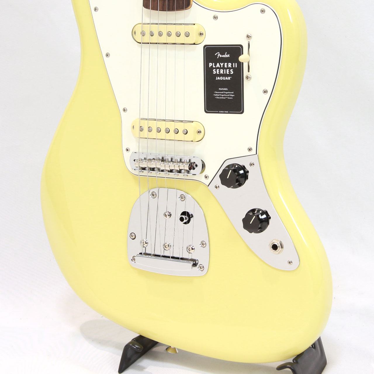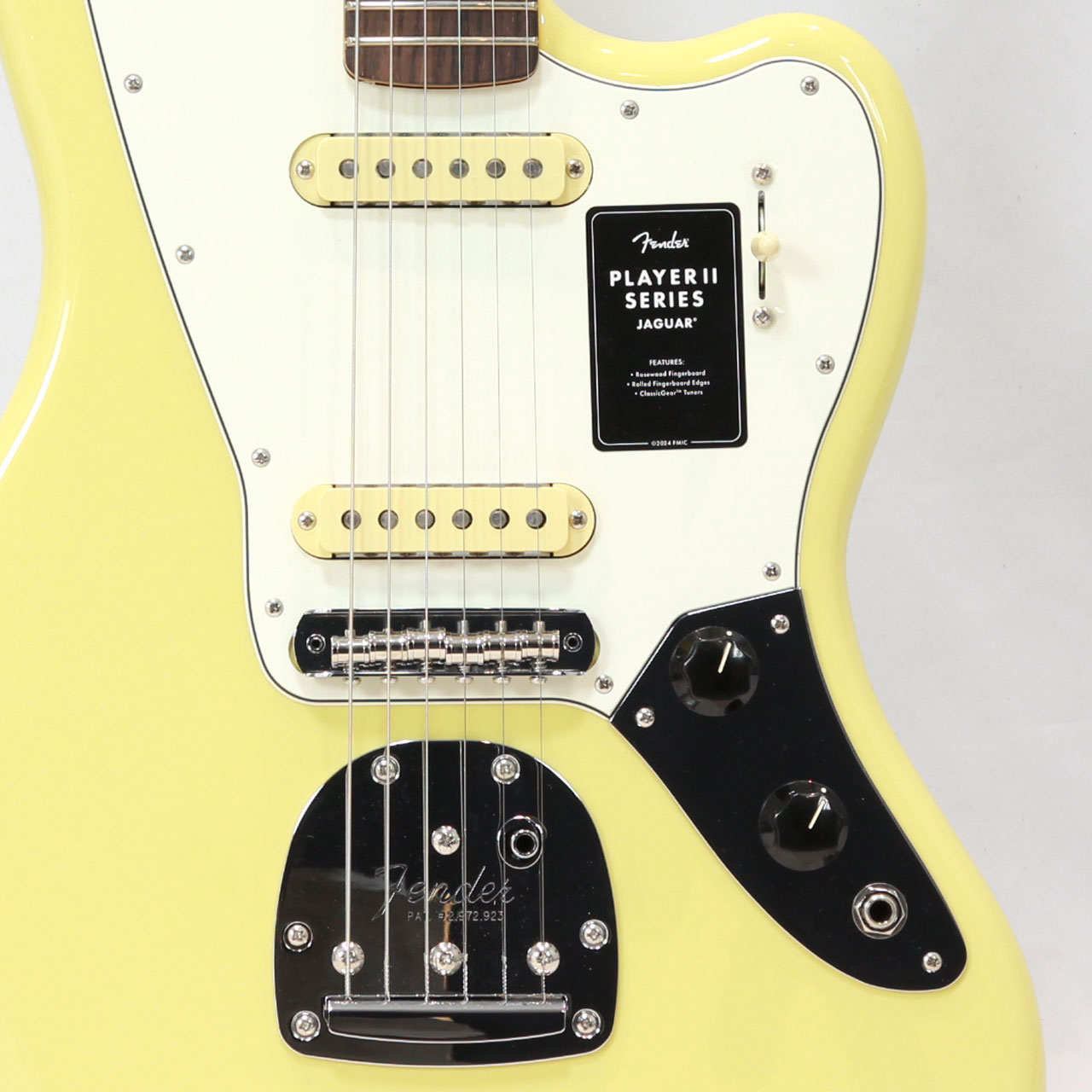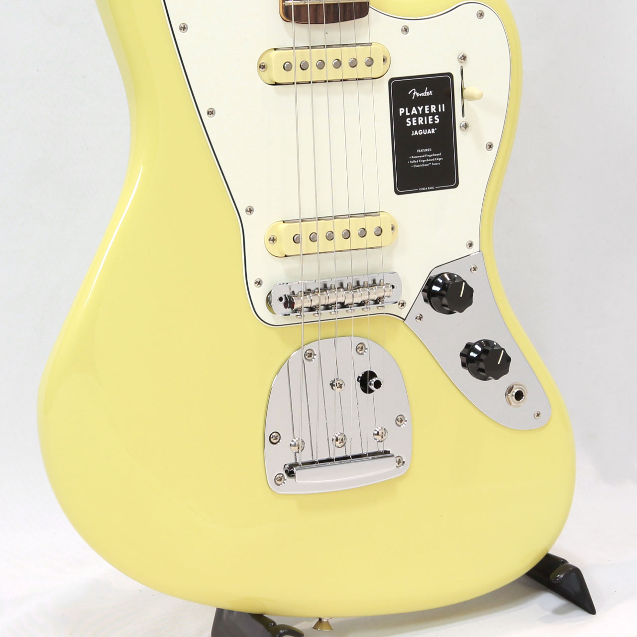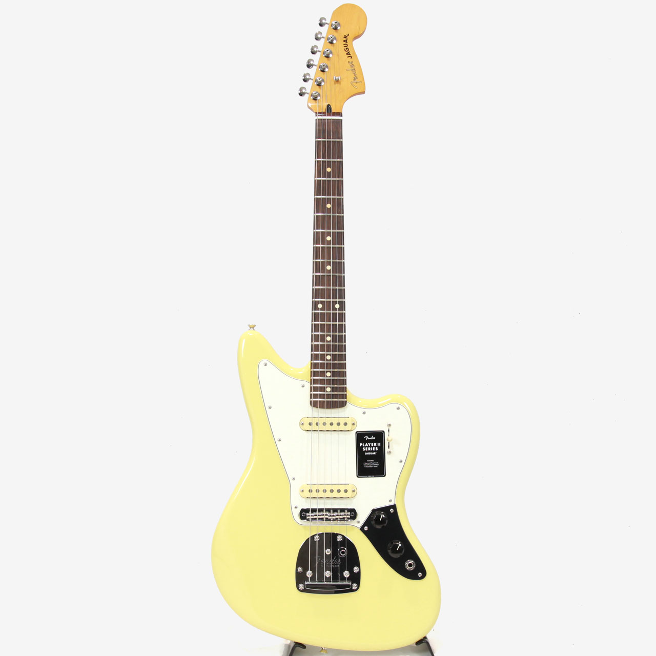クラシックなトーンウッドであるアルダーボディを採用したPlayer II Jaguar?は、伝統的なフェンダーフィニッシュ、またはフェンダーのカラーアーカイブから発掘され、本シリーズで初採用となる新フィニッシュなど、幅広いカラーの選択肢をご用意しています。Player Series Alnico V(ブリッジ)とAlnico II(ネック)Single-Coil Jaguarピックアップからはクリスタルのように澄み渡ったネックポジションのクリーントーンとバイト感に溢れるブリッジポジションのサウンドが得られます。3ウェイブレードスイッチにより、多彩なサウンド設計が可能です。フローティングトレモロと、アップグレードされたMustangサドル付き6サドル式Jaguarブリッジと、ClassicGear?チューニングマシンによりチューニングの安定性と豊かな表現力が確保され、無限のサウンドの可能性を追求できる柔軟性を備えています。