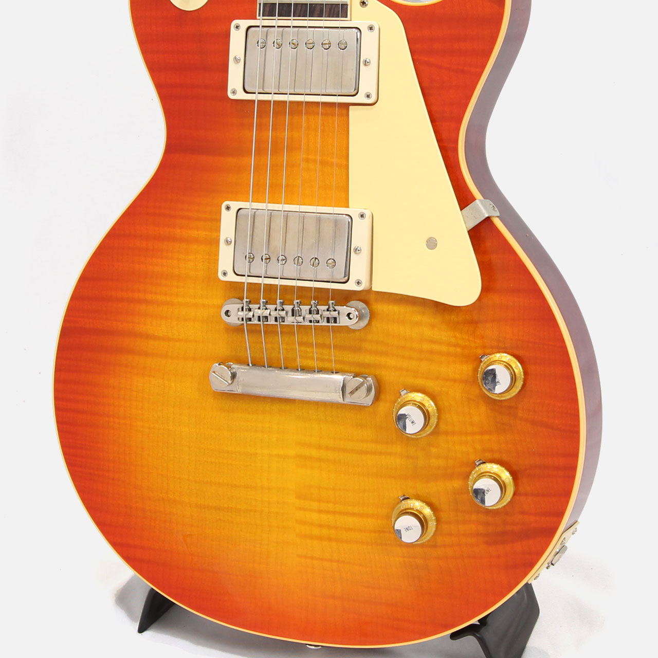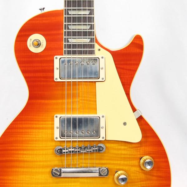 外周のチェリーがオレンジっぽい残り方のTangerine Burstカラーは鮮やかな仕上がりで60レスポールを象徴するルックスに仕上がっております。最大の特徴であるスリムネックシェイプはプレイアビリティも高く、鳴りの反応が良いのでリードギターにおいて幅広い活躍が期待できます。