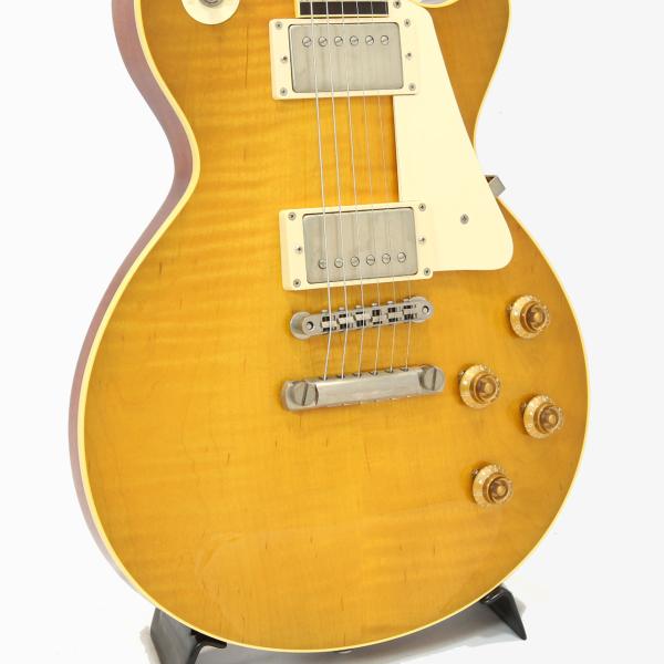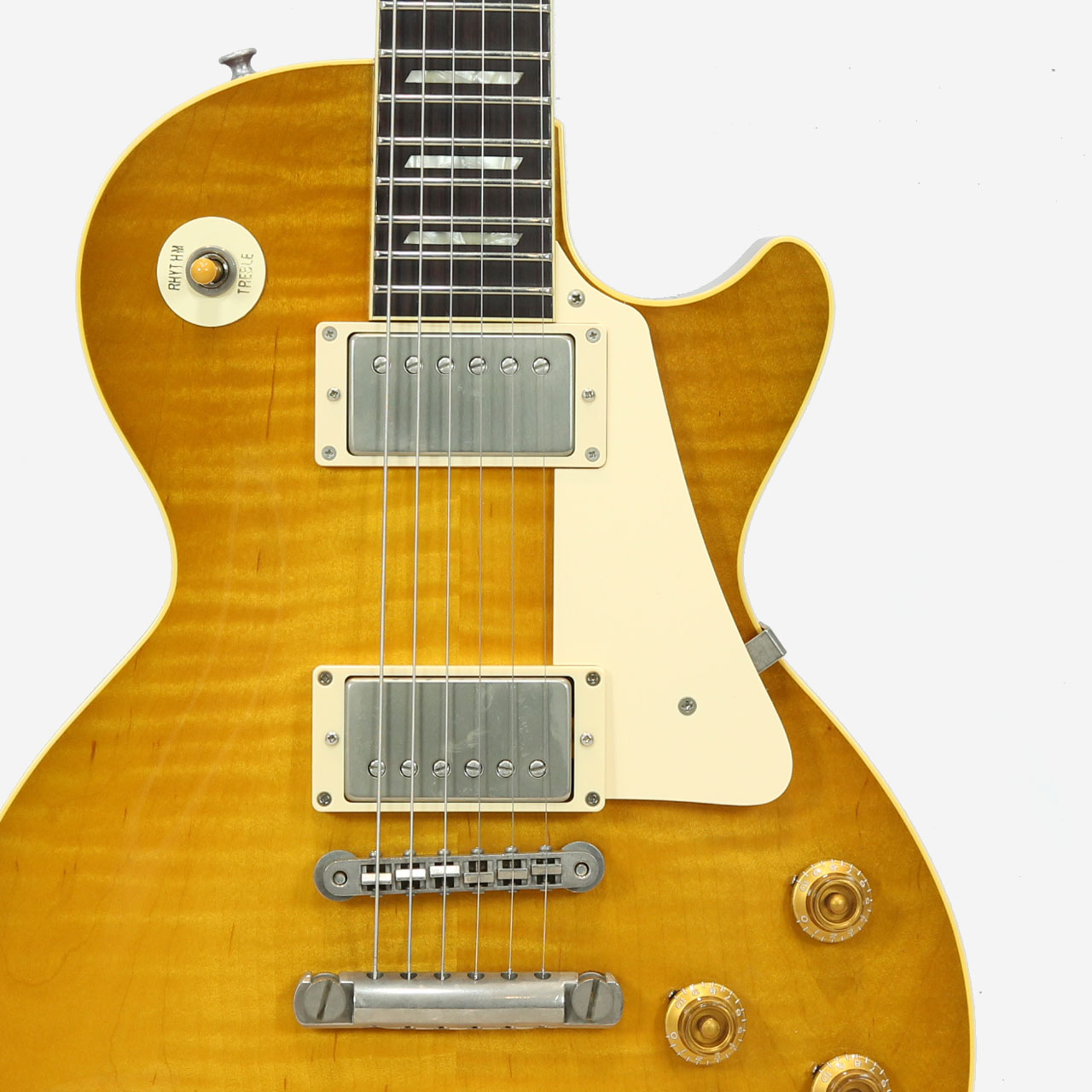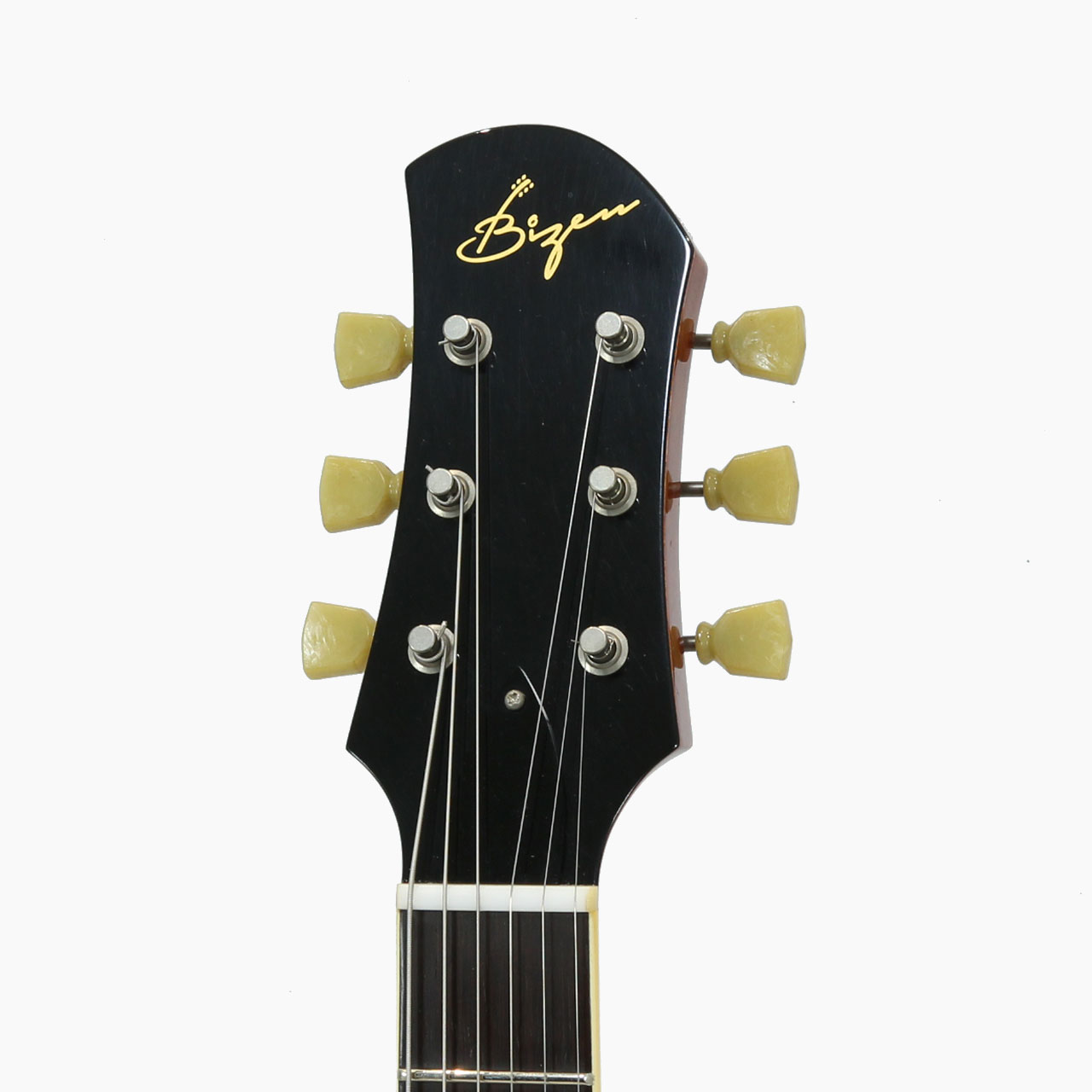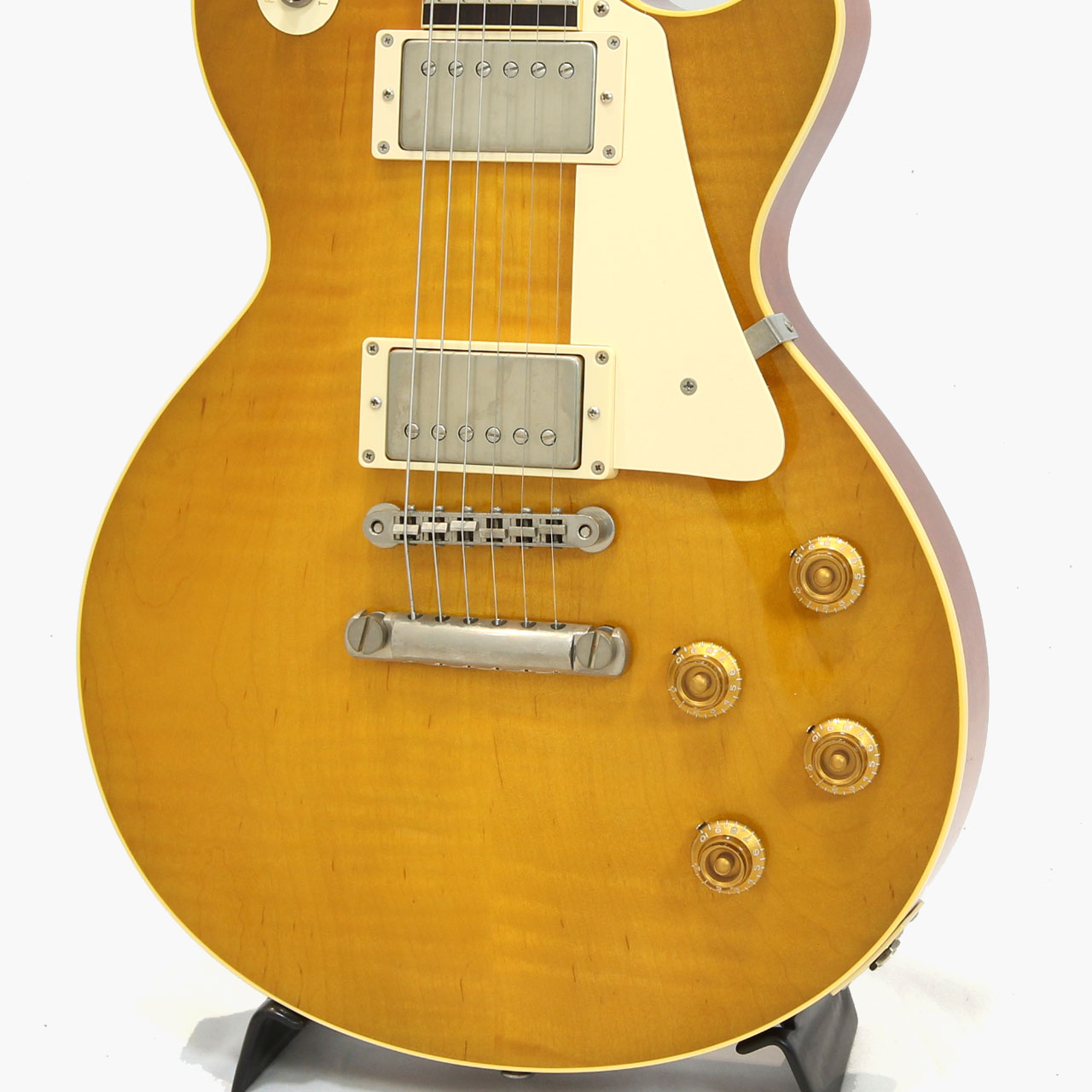 今回入荷したBurned STD。Bizen Worksのアイデンティティをふんだんに盛り込んだフラッグシップシリーズのGrainに対して本機は50年代LPに最大限の敬意を評し作られるシリーズ。高いセンスが要求されるレモンドロップ系は程よい退色感が演出され良質な仕上がりです。ホンジュラスマホガニー、ハードロックメイプルで構成されたボディマテリアルはヴィンテージLPトーンにおいて重要なポイント、希少なマテリアルを惜しげもなく採用しております。ヴィンテージに倣ってボディとネックの接着にはニカワを採用、抜かり無しです。