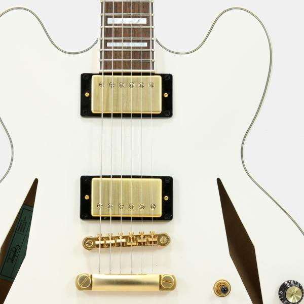 わずかにエイジド加工されたゴールド・ハードウェアがオーソドックスなセミアコスタイルながらどこにも無いビンテージ感溢れる雰囲気を漂わせる個性的ルックスに仕上がっています。