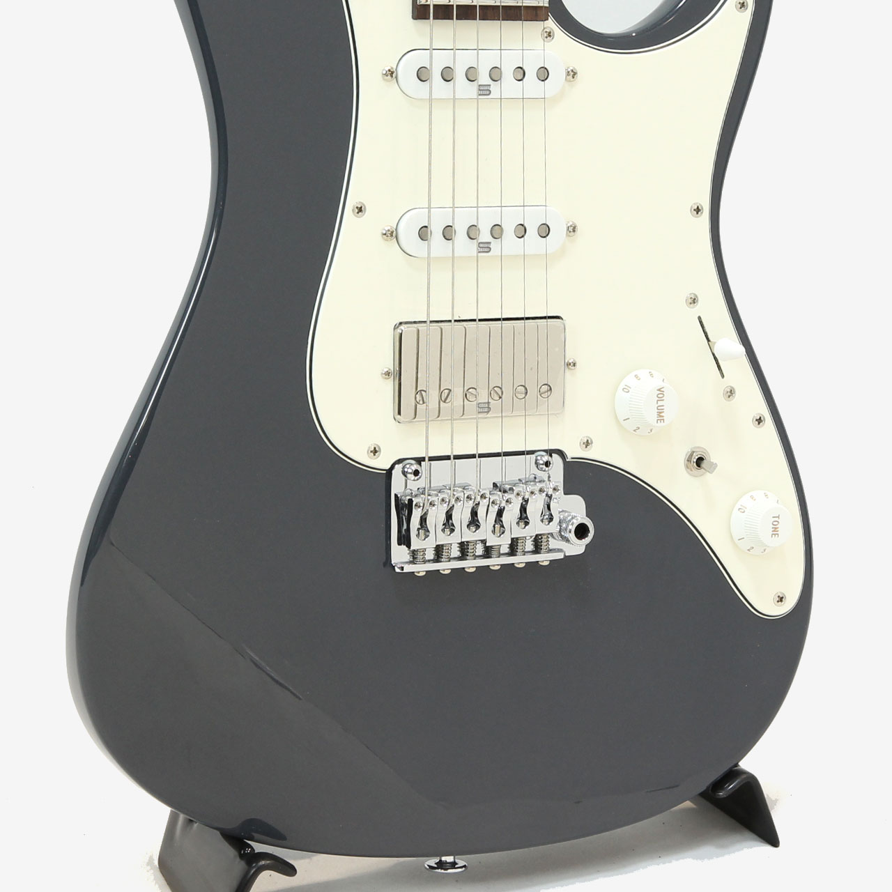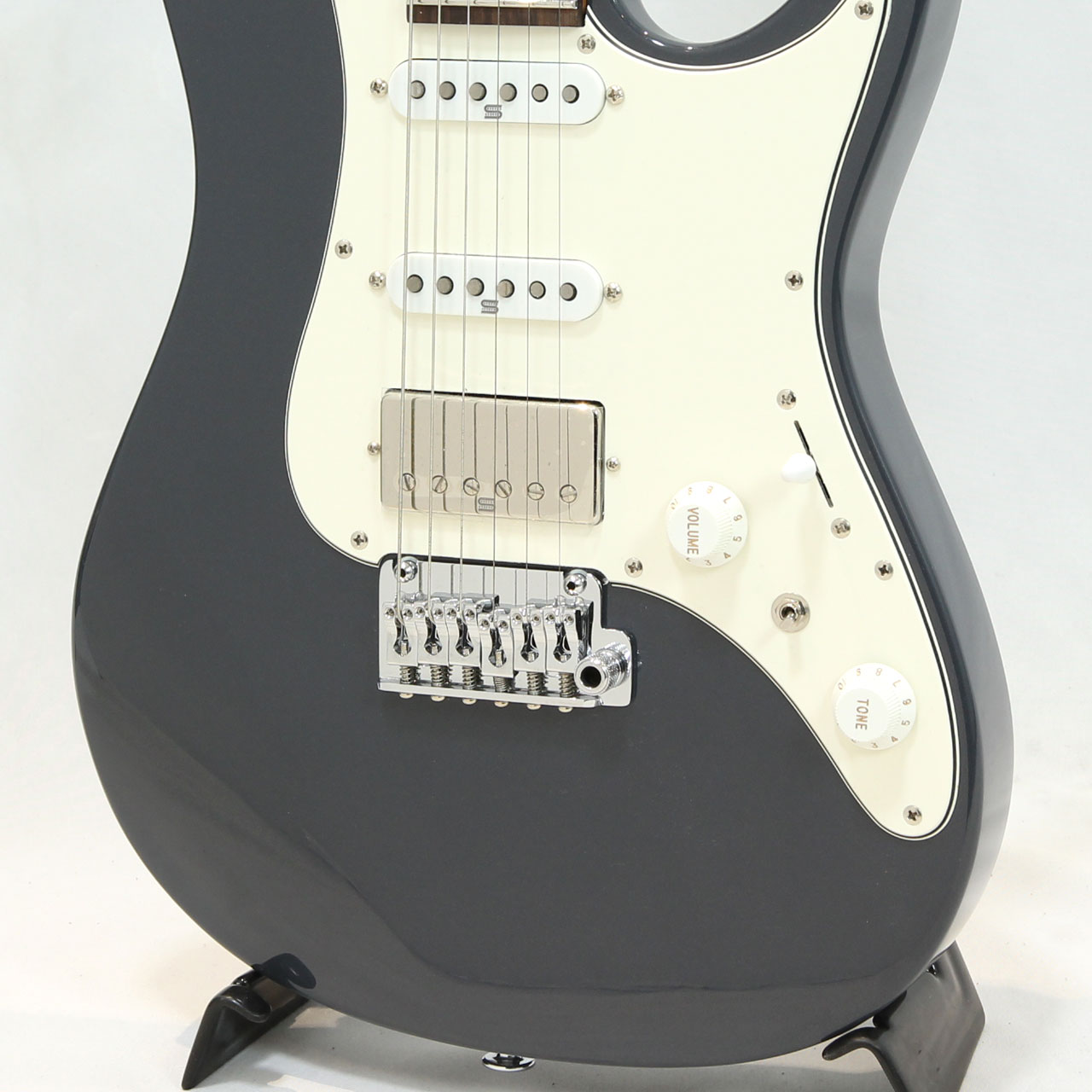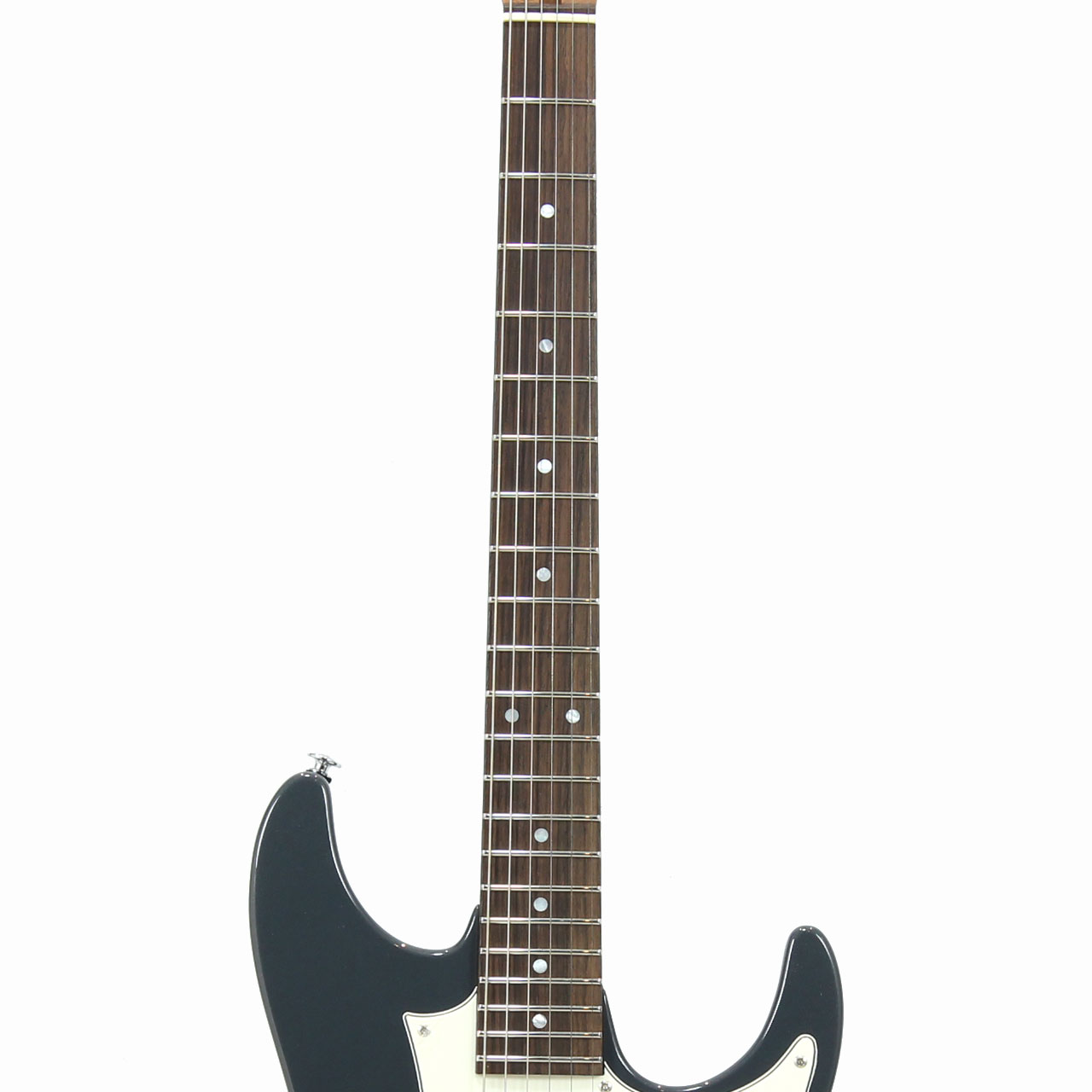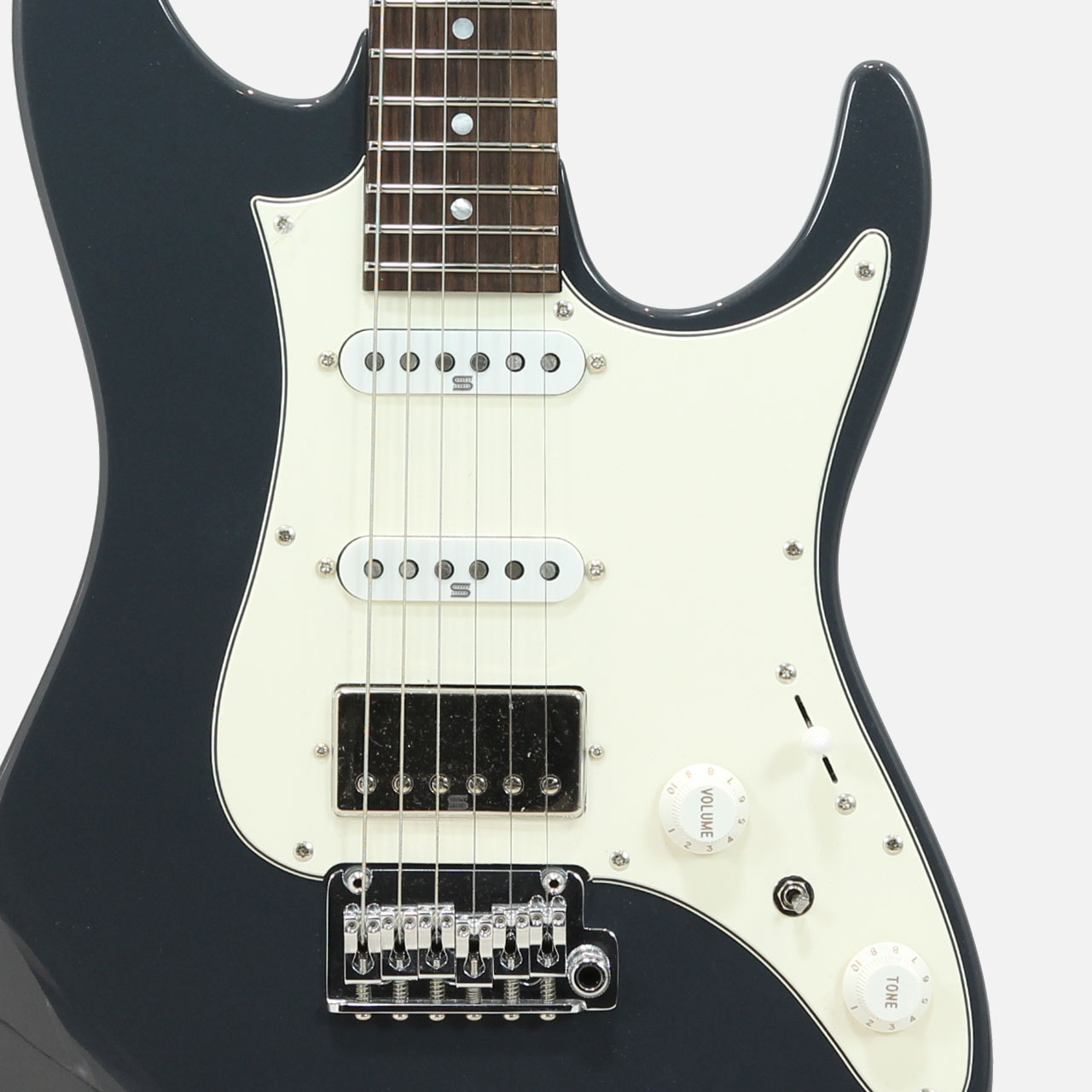 GOTOH製マグナムロックペグ、シンクロトレモロ、ステンレスフレット、ボディのコンターやネックジョイント部の球面仕上げ、蓄光素材のサイドポジションマークなど現代的な演奏性の高さを求めてひと手間ふた手間かけた拘りの感じられる一本。