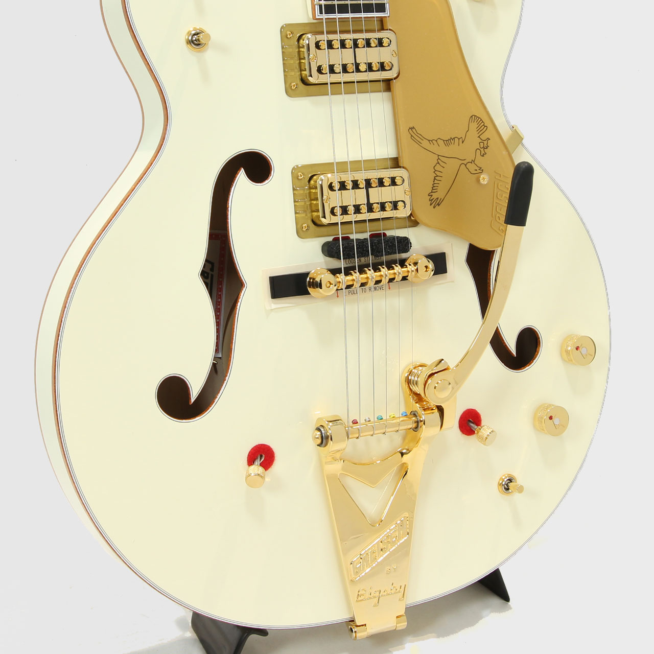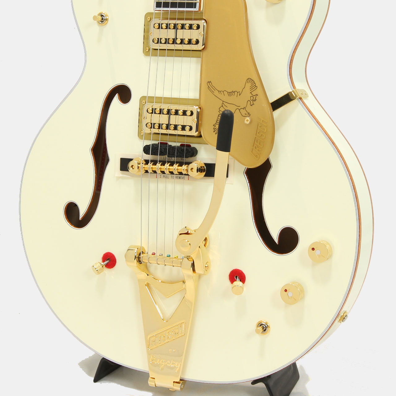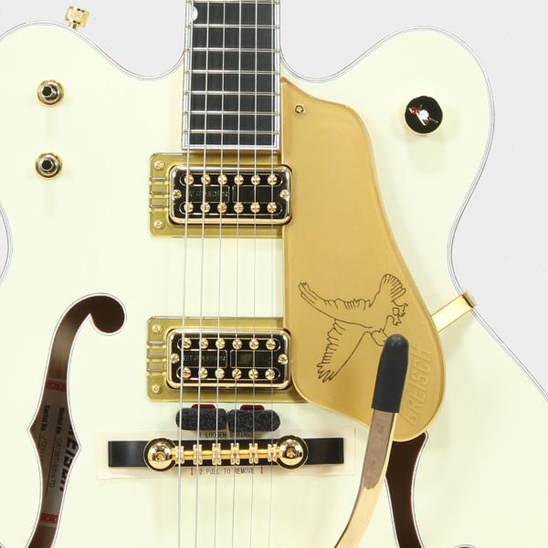 ハードウェアはすべてゴールドで統一され、ジュエルGアローノブ、Bigsby B6Gを搭載し、ピン止めエボニーベースにSpace Controlブリッジ、ヴィンテージスタイルの厚みのあるプレキシピックガードを組み合わせています。