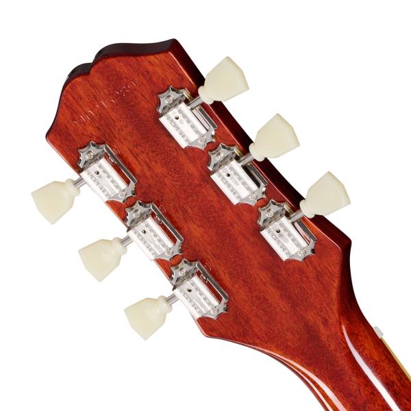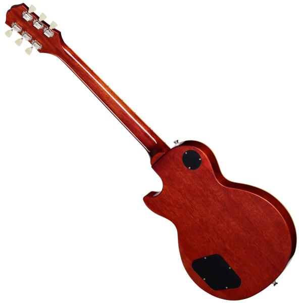ボディ・トップにはメイプルが貼られ、上面にはAAA グレードのフレイム・メイプル化粧板があしらわれています。1959ラウンド・ミディアム・Cシェイプのネックにはバインディングが施され、ロング・ネック・テノン方式でボディにジョイントされています。ローレル指板にはクラシカルなディッシュ・インレイが施され、カラマズー・ヘッドストックにはヴィンテージ・デラックス・チューナーを搭載。電装系には定評のある2基のProbuckerハムバッカー・ピックアップ、ダイヤル・ポインタ付きのゴールド・トップハット・ノブを採用。Graph Techナット、CTSポット、往時の製法に則った配線など、拘りの仕様群により魅力が一層高められています。Epiphoneプレミアム・ギグバッグが付属となります。