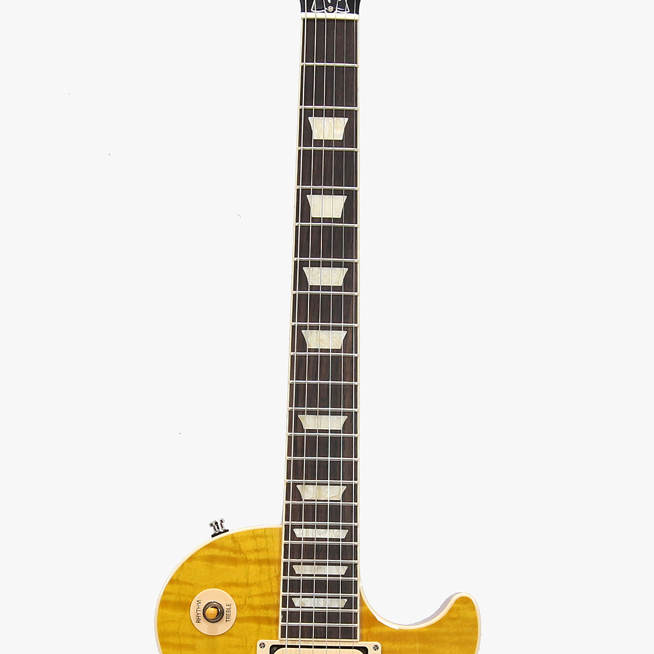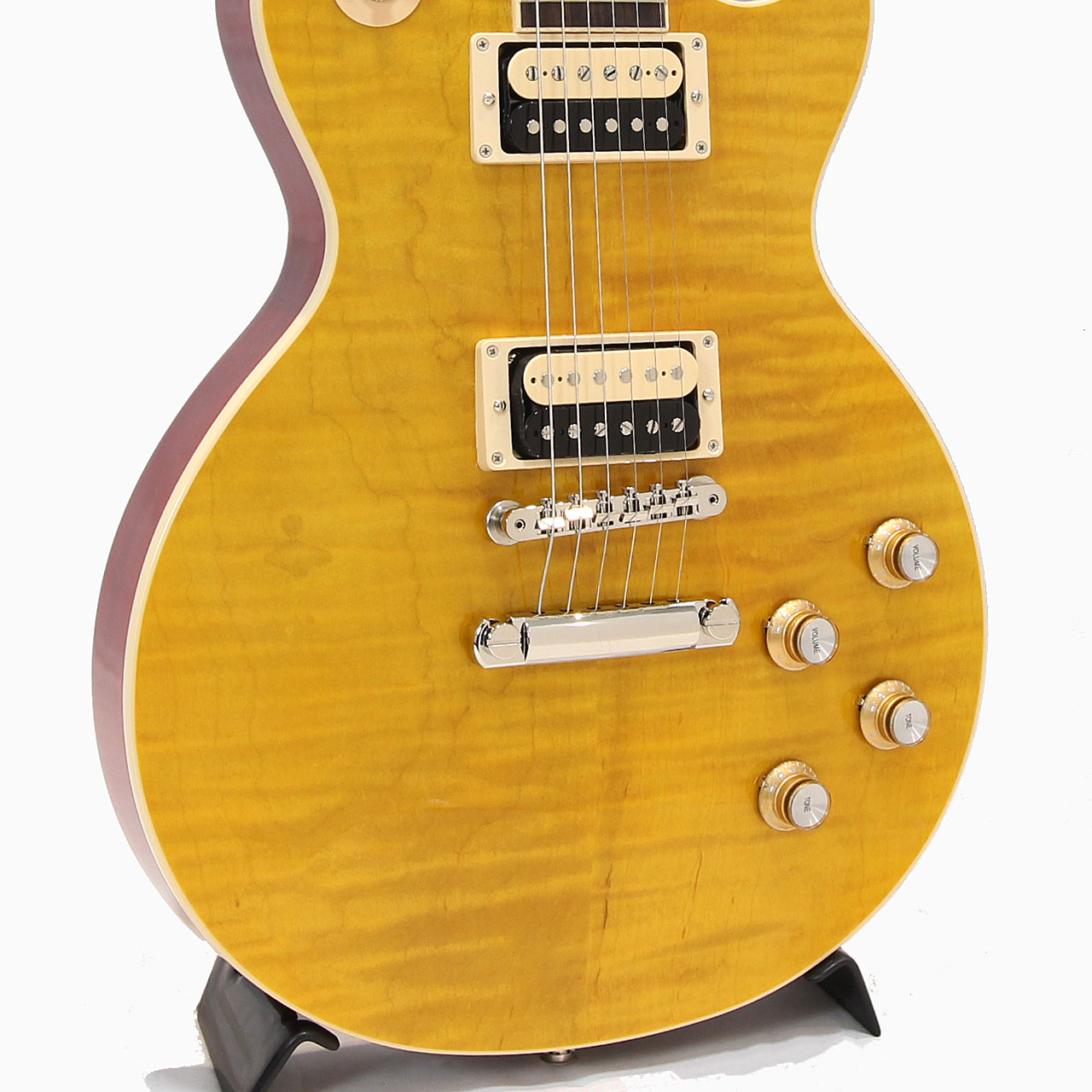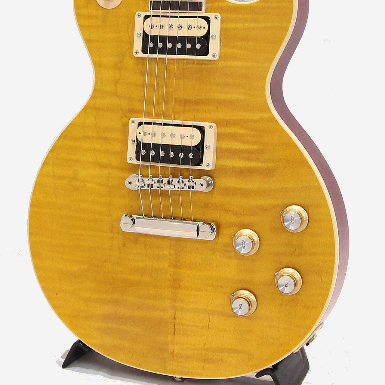 AAAフィギャード・メイプルトップ/マホガニーボディバックは王道のレスポールマテリアル。AAAグレードのフレイムトップはUSAラインナップでも多くなく、美麗なルックスに欠かせません。そしてスラッシュお気に入りのCシェイプ・ネック・プロファイルは握りごたえのある肉厚なネックシェイプながらとっつきにくさは無く長時間のプレイもラクラク可能です。中域のきいた濃厚なトーンをアウトプットしてくれる大きな要因です。