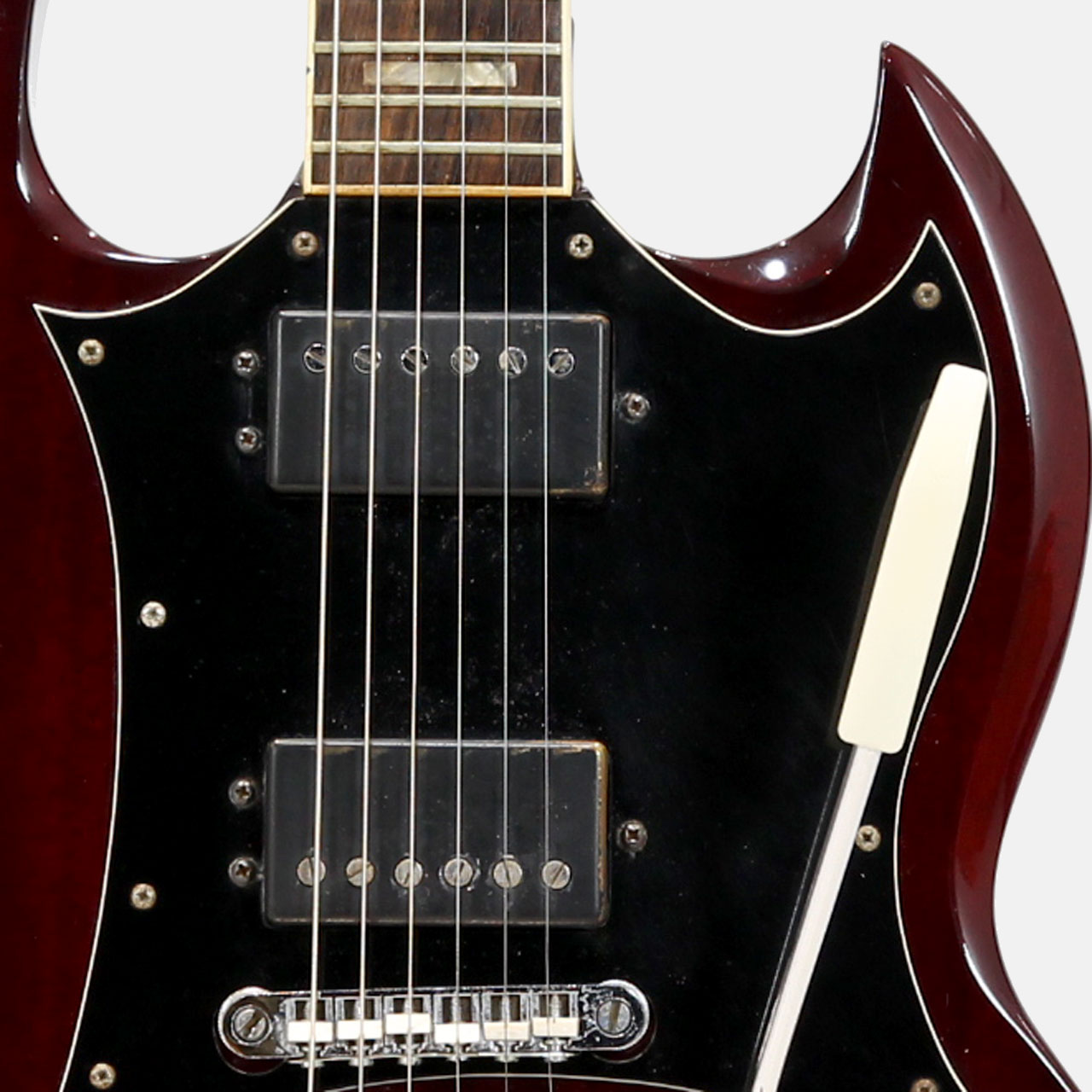 初期モデルということもありスプリットダイヤモンドインレイに積層バインディング、ボルトオンスタイルと本家への再現度よりもアイデンティティを前面に出した仕様が見られる1本。サウンドも年月を経たことによる独特のヤレ感やペタッとした素直な出音が特徴で扱いやすく多くのプレイヤーに楽しんでもらえるようなサウンドとなっております。