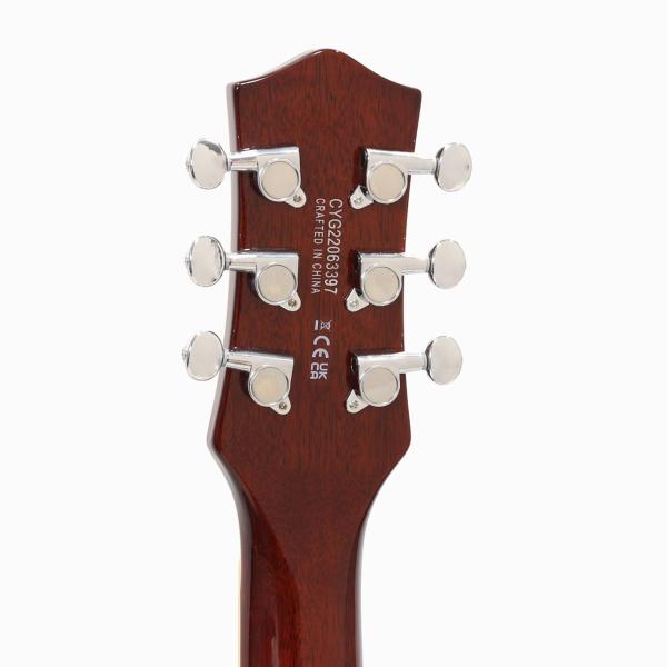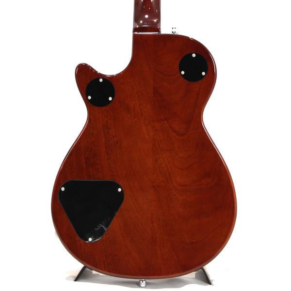 マホガニーネック、アーチドのメイプルトップにチェンバードのマホガニーボディ、チューンOマチック、そして個性的なVテールピースがエレマチならではの個性を主張しています。Black Top Broad'Tronピックアップがパワフルにアウトプット。グレッチならではの2ボリュームに、マスタートーンにマスターボリュームを追加した仕様はライブでの使い勝手も良好です。