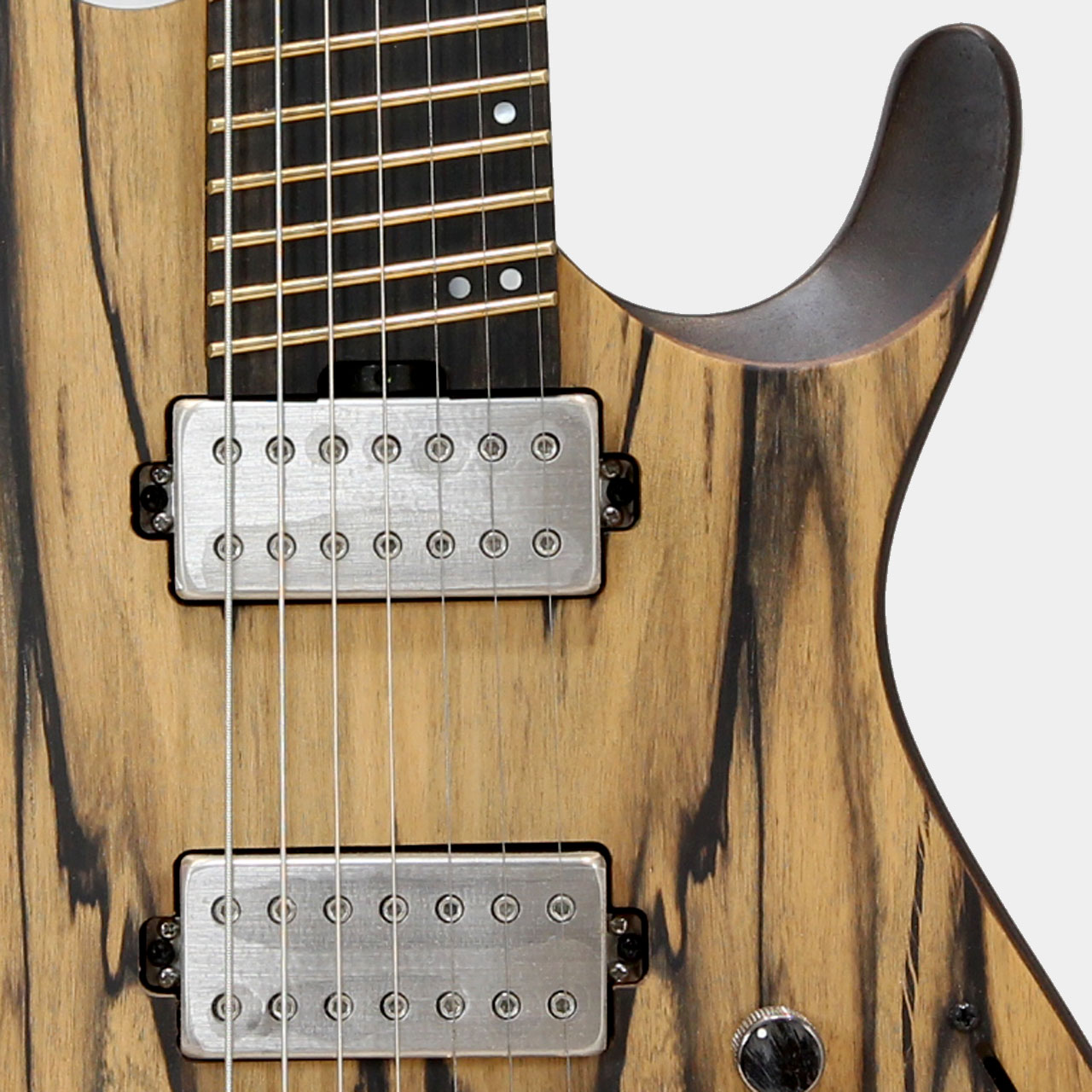 ピックアップは本シリーズのために開発されたピックアップ"Q58-7"を搭載しております。エフェクター等でサウンドメイクしやすいよう、全帯域がバランスよく聴こえるように設計されています。低域は濁らずパワフルで歪ませても7弦音がぼやけることもなく、高域はクリアでありながらもまろやかなサウンドです。また、ローノイズでデジタルエフェクター、アナログエフェクター両方ともに相性抜群です。