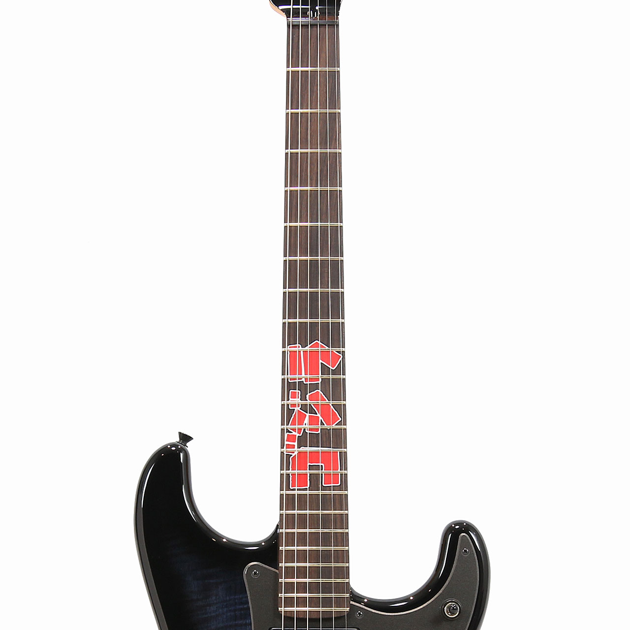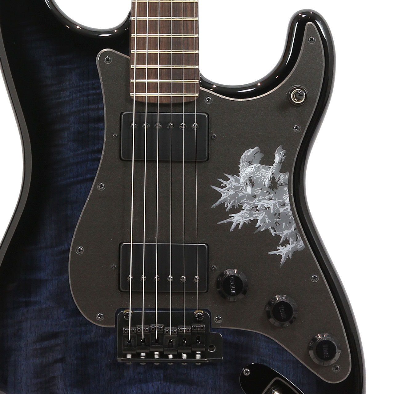 アルダーボディにマートルウッドを貼り合わせ、深みのあるブルーで染色しグロスフィニッシュで仕上げることでゴジラならではの重厚な存在感を表現。ネックは“Modern C”シェイプで、22フレット仕様のミディアムジャンボフレットを採用し、指板の12フレット付近にはゴジラのロゴが大胆にあしらわれており、視覚的にも強いインパクトを与えます。