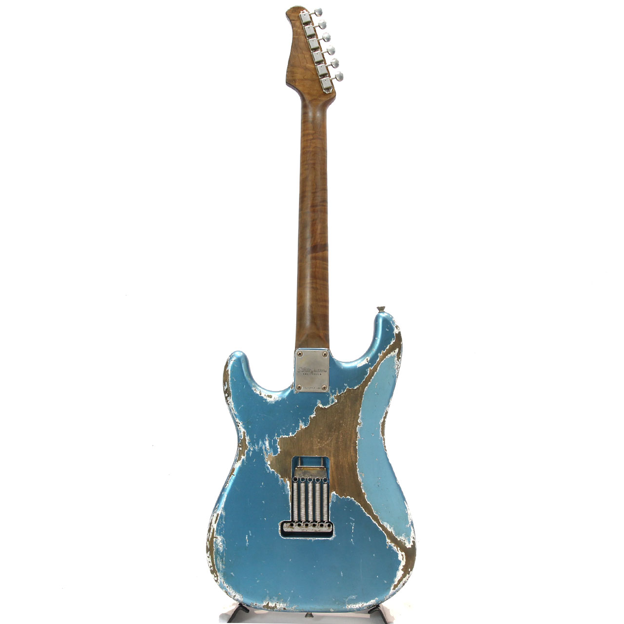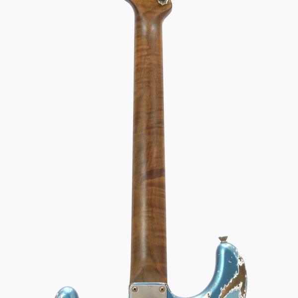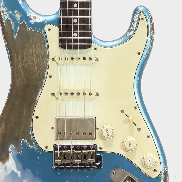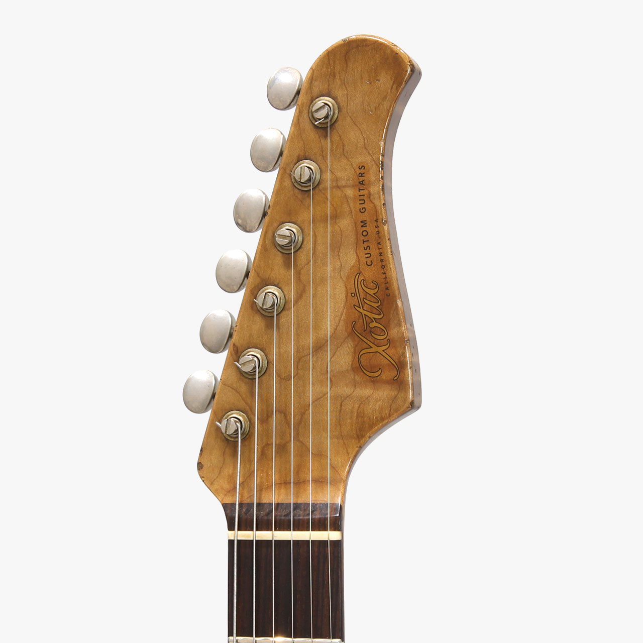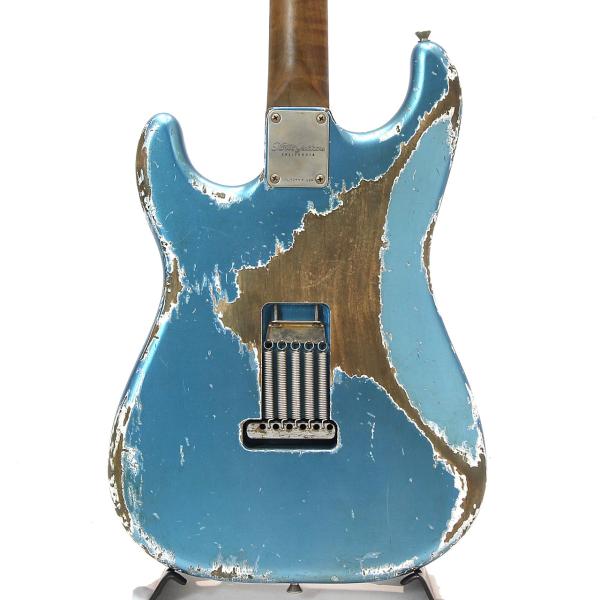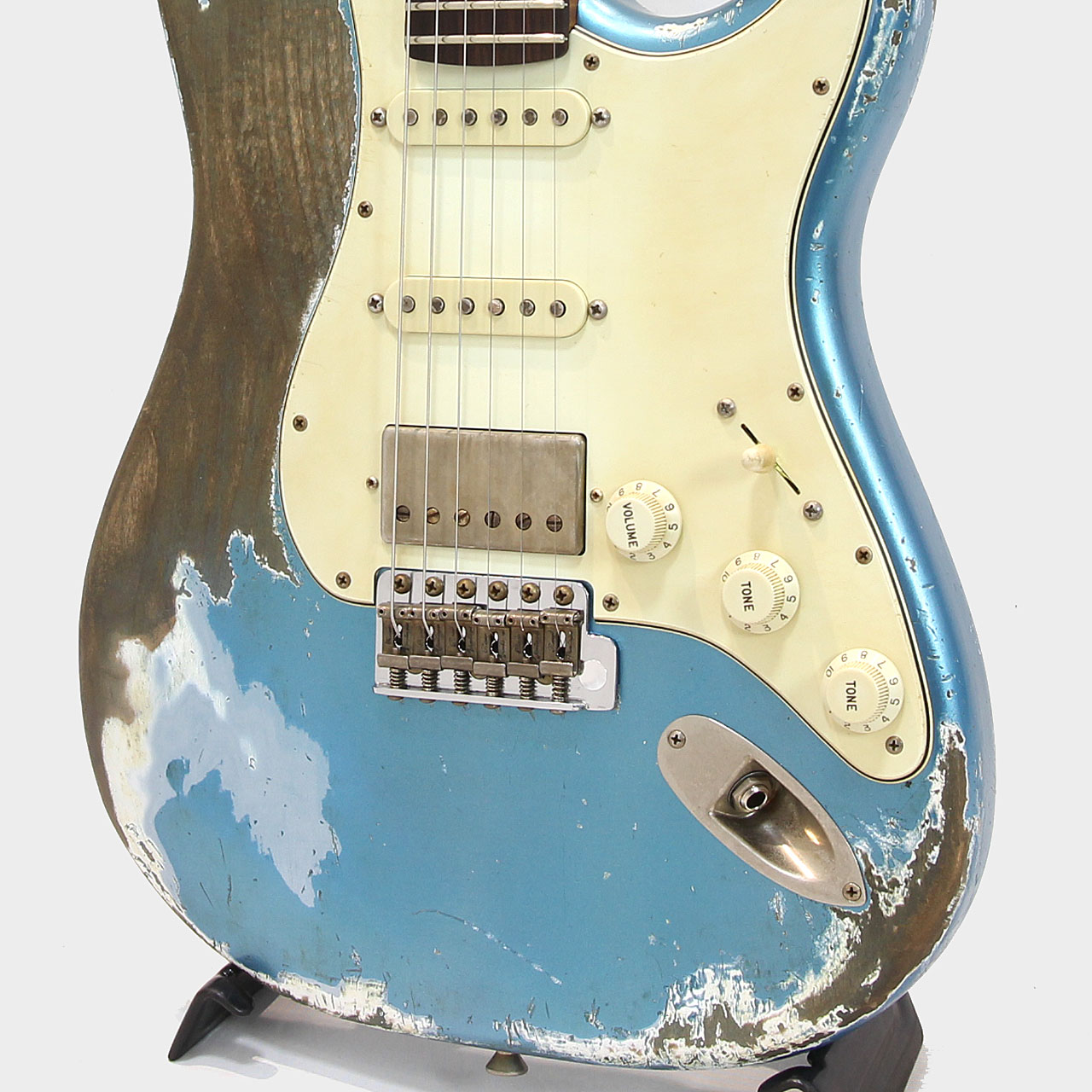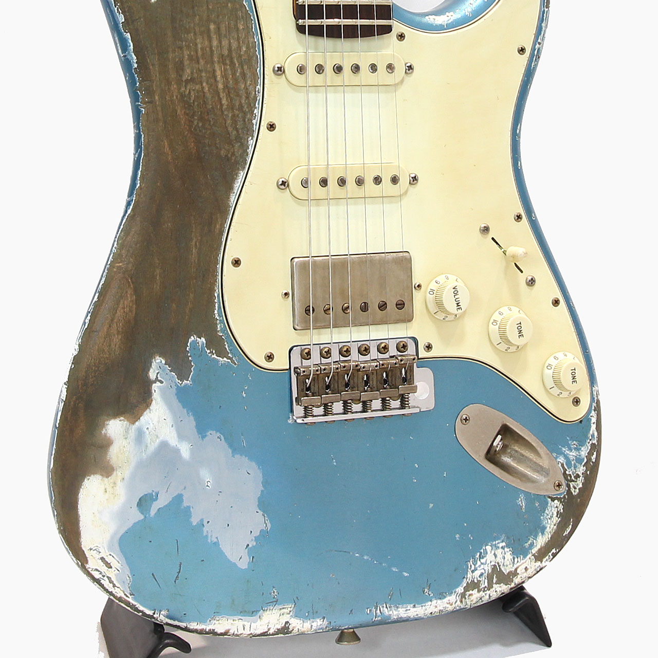 同社人気カラーであるLake Placid BlueにSSHのSTスタイル。PAF系のカバードハムバッカーを搭載したコンポーネントスタイル発祥モデルの様な1本。それを大胆にスーパーヘビーエイジド仕上げで製作してもらいました。一度見たら忘れられない歴戦の勇士の様なルックスとなっております。ただ、嫌味の無い絶妙の仕上げ感がXoticのポイント。サウンドはもちろんですが、どんなジャンルやスタイルのギタリストもしっかりハマってくれると思います。ステージ映えもバツグンです!!