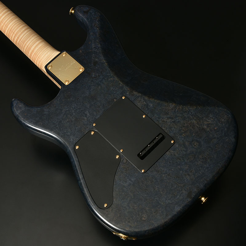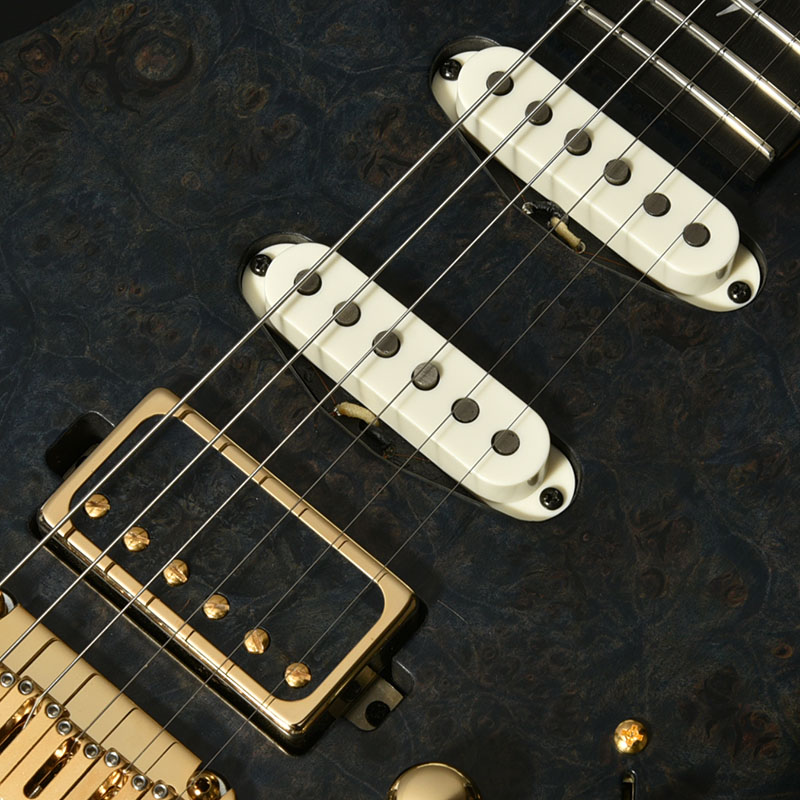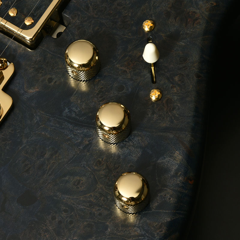 厳選された「バールメイプル」1ピースボディ「バール (Burl)」とは、樹木が生育する過程で幹の根元にできたコブの部分のことを指します。すべての木々に現れるわけではなく、その個性的な見た目と希少性から貴重な木材として取引されています。本モデルはその杢目を余すことなくご堪能いただけるよう、ピックガードを廃した仕様となっています。