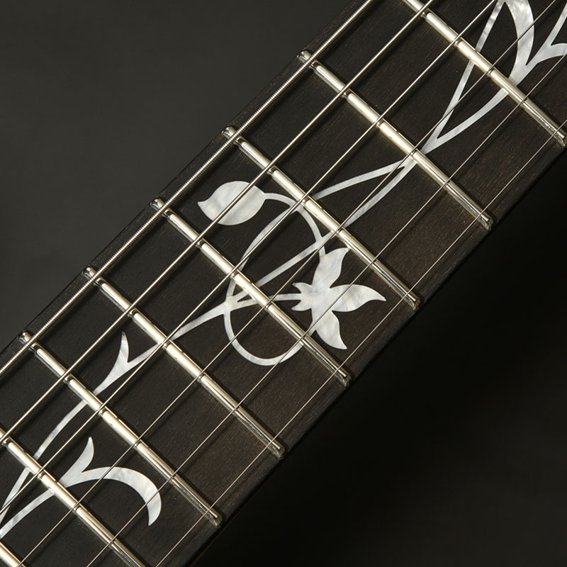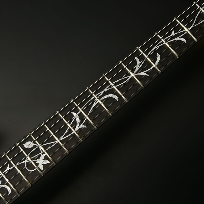 ツリーオブライフのインレイが施された指板には、黒々とした高級感のあるルックスでおなじみのエボニー材を採用。定番のローズウッドなどに比べて重量があり、立ち上がりが早く輪郭のあるトーンと伸びやかなサスティーンを生み出します。ネック材の柾目フレイムメイプルは、ヘッドストックの先端までストライプの入ったハイグレードな個体を厳選。芸術的なルックスをぜひその目でお確かめください。