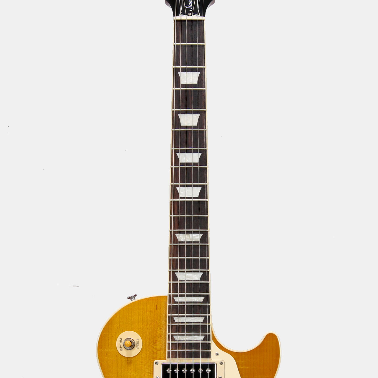 ノンウエイトリリーフの完全ソリッドボディのマホガニーボディにメイプルトップ、マホガニーネックにローズウッド指板。ネックは自然なグリップ感に60sレスポール最大の特徴であるスリムテーパーマホガニーネックを採用。良質な鳴りと弾いていてストレスの無い細めのネックがプレイアビリティを高めてくれています。